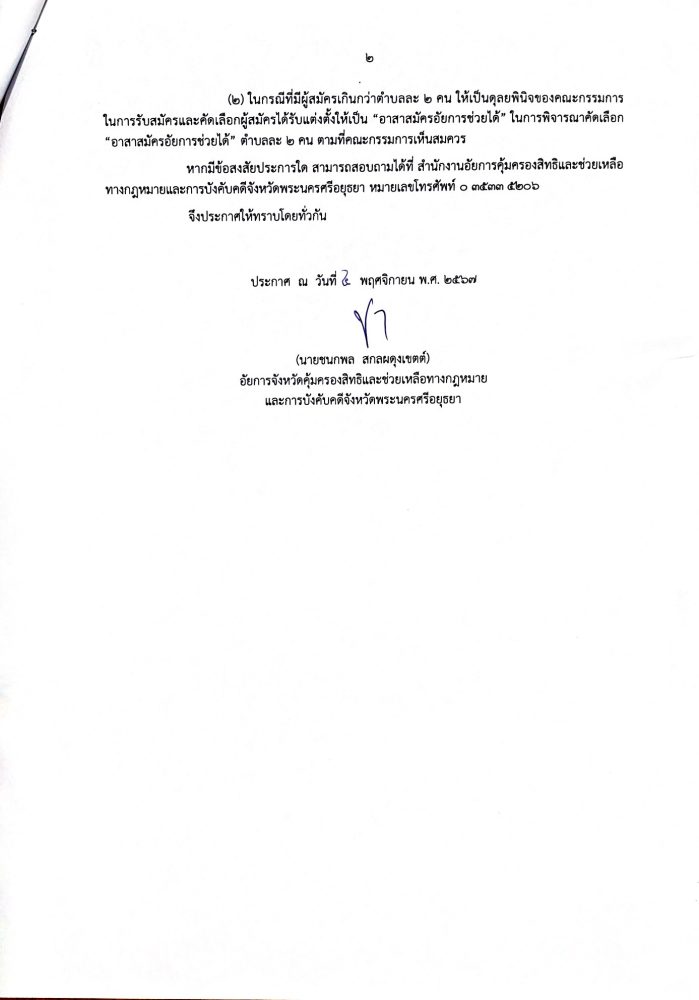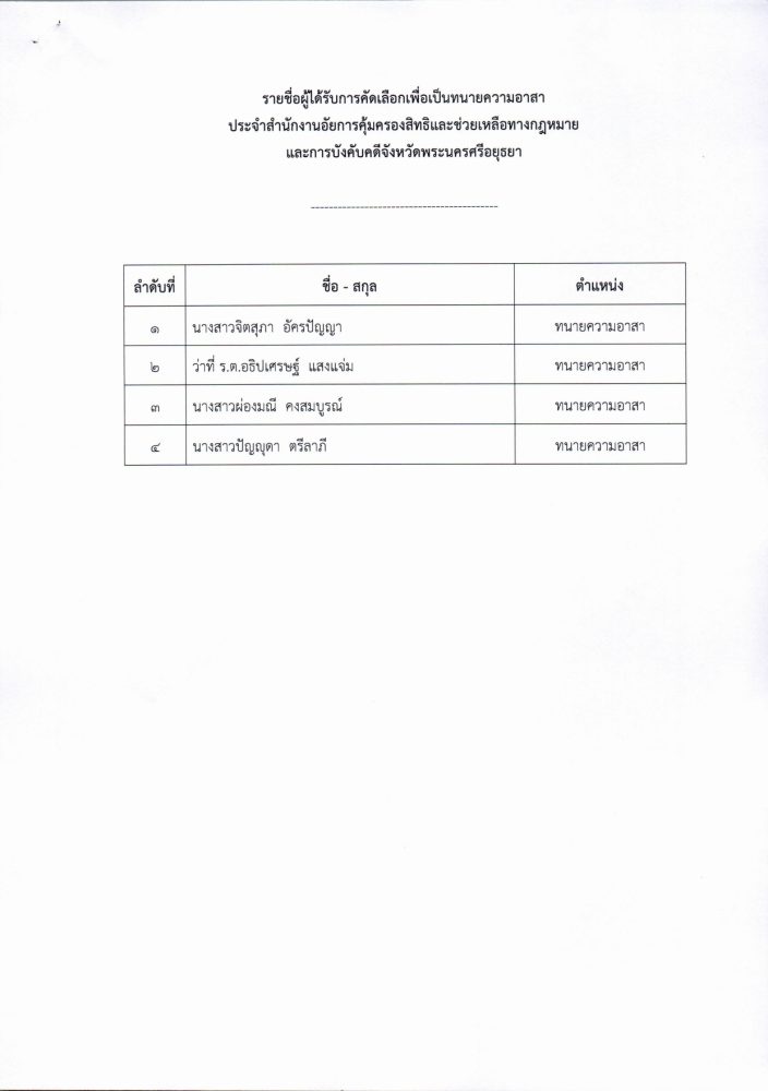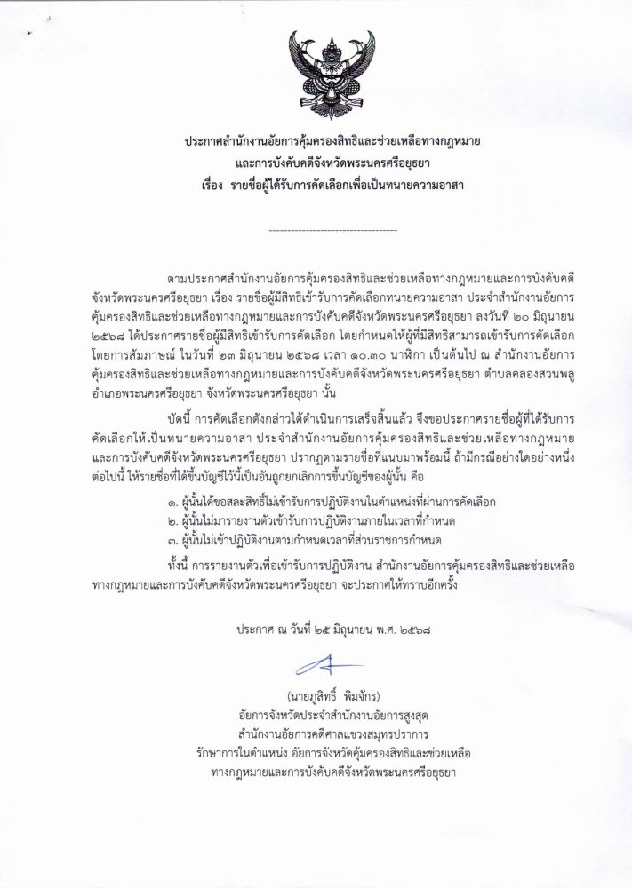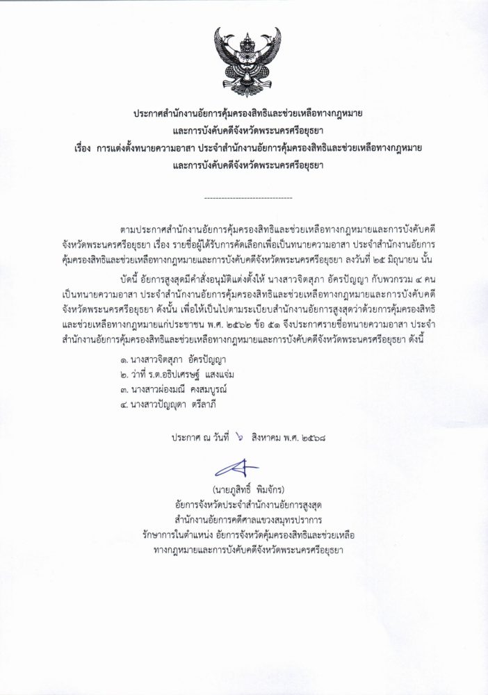 เรื่อง การแต่งตั้งทนายความอาสา ประจำประกาศสำนักงานอัยการคุ้มครองสิทธิและช่วยเหลือทางกฎหมายและการบังคับคดีจังหวัดพระนครศรีอยุธยา