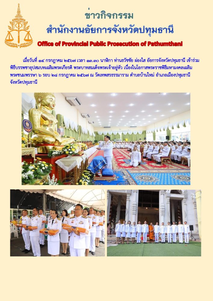 วันที่ 23 กรกฎาคม 2567 นายธวัชชัย ผ่องใส อัยการจังหวัดปทุมธานี พร้อมด้วยข้าราชการฝ่ายอัยการ สำนักงานอัยการจังหวัดปทุมธานี เข้าร่วมพิธีมหามงคลเฉลิมพระชนมพรรษา 6 รอบ 28 กรกฎาคม 2567 ณ สำนักงานอัยการจังหวัดปทุมธานี