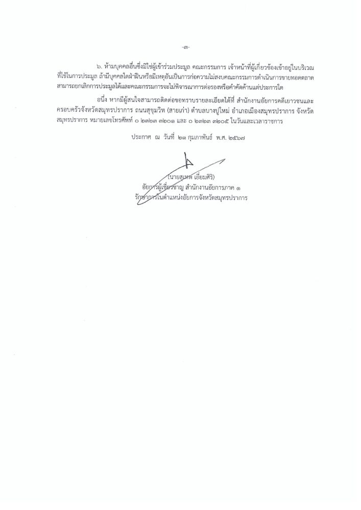 ในวันพฤหัสบดีที่ ๗ สิงหาคม ๒๕๖๘ เวลา ๐๗.๐๐ นาฬิกา ณ อาคารอเนกประสงค์ ชั้น ๓ ศาลจังหวัดสมุทรปราการ