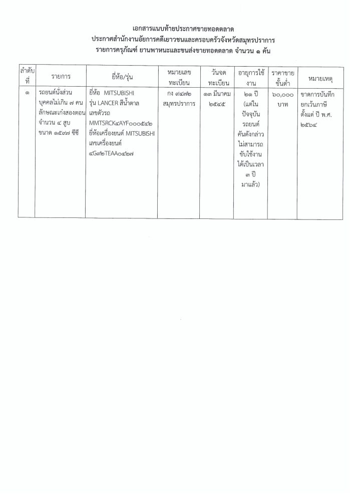 ประกาศสำนักงานอัยการจังหวัดสมุทรปราการ เรื่อง ขายทอดตลาด ครุภัณฑ์ยานพาหนะและขนส่ง กรณีชำรุด เสื่อมสภาพและไม่จำเป็นต้องใช้ในราชการ จำนวน ๑ คัน