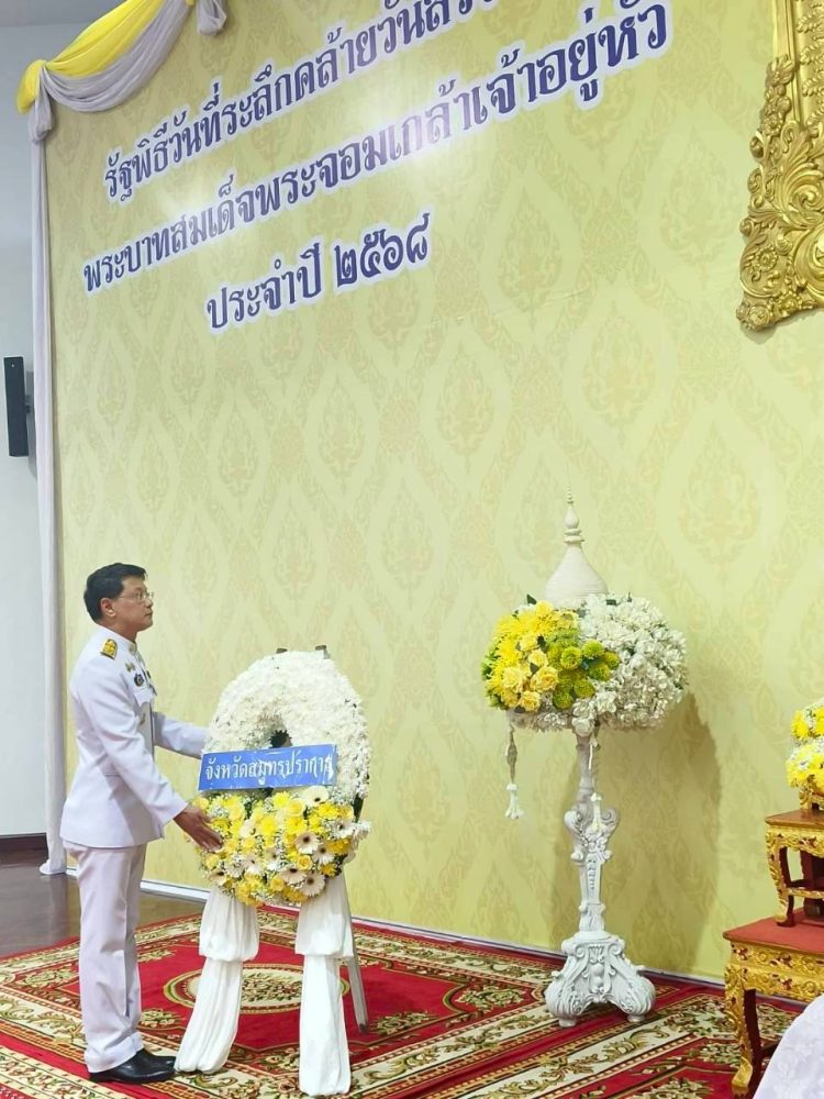 ในวันอังคารที่ ๒๕ พฤศจิกายน ๒๕๖๘ เวลา ๐๗.๐๐ นาฬิกา นางสาวณิชา ธรรมนิจกุล อัยการจังหวัดผู้ช่วย ผู้แทนอัยการจังหวัดคดีเยาวชนและครอบครัวจังหวัดสมุทรปราการ พร้อมด้วยเจ้าหน้าที่ เข้าร่วมพิธีเจริญพระพุทธมนต์และทำบุญตักบาตร ถวายพระราชกุศล พิธีวางพวงมาลาถวายราชสักการะ พระบาทสมเด็จพระมงกุฏเกล้าเจ้าอยู่หัว เนื่องในโอกาสวันคล้าย วันสวรรคตครบ ๑๐๐ ปี และพิธีวางพุ่มดอกไม้ถวายสักการะ สมเด็จพระเจ้าภคินีเธอเจ้าฟ้าเพชรรัตนราชสุดา สิริโสภาพัณณวดี