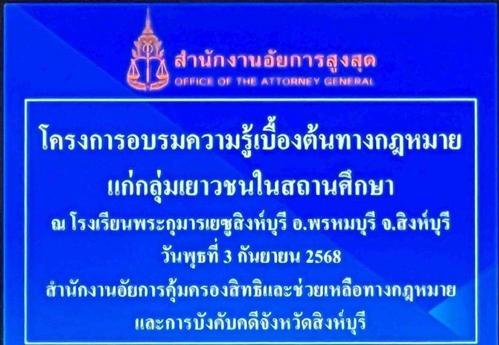 เมื่อวันที่ 3 กันยายน 2568 สำนักงานอัยการคุ้มครองสิทธิและช่วยเหลือทางกฎหมายและการบังคับคดีจังหวัดสิงห์บุรี จัดโครงการอบรมความรู้เบื้องต้นทางกฎหมายแก่กลุ่มเยาวชนในสถานศึกษา เพื่อส่งเสริมความรู้ด้านกฎหมายให้แก่นักเรียนชั้นมัธยมศึกษาปีที่ 1- มัธยมศึกษาปีที่ 3 รวมจำนวน 140 คน โดยภายในโครงการมีการบรรยายในหัวข้อความรู้เกี่ยวกับการป้องกันและลดความเสี่ยงจากโรคติดต่อเชื้อเอสไอวี/เอดส์ โดยวิทยากรจากสำนักงานสาธารณสุขจังหวัดสิงห์บุรี รวมอยู่ด้วย จัดขึ้น ณ โรงเรียนพระกุมารเยซูสิงห์บุรี ตำบลโรงช้าง อำเภอพรหมบุรี จังหวัดสิงห์บุรี
