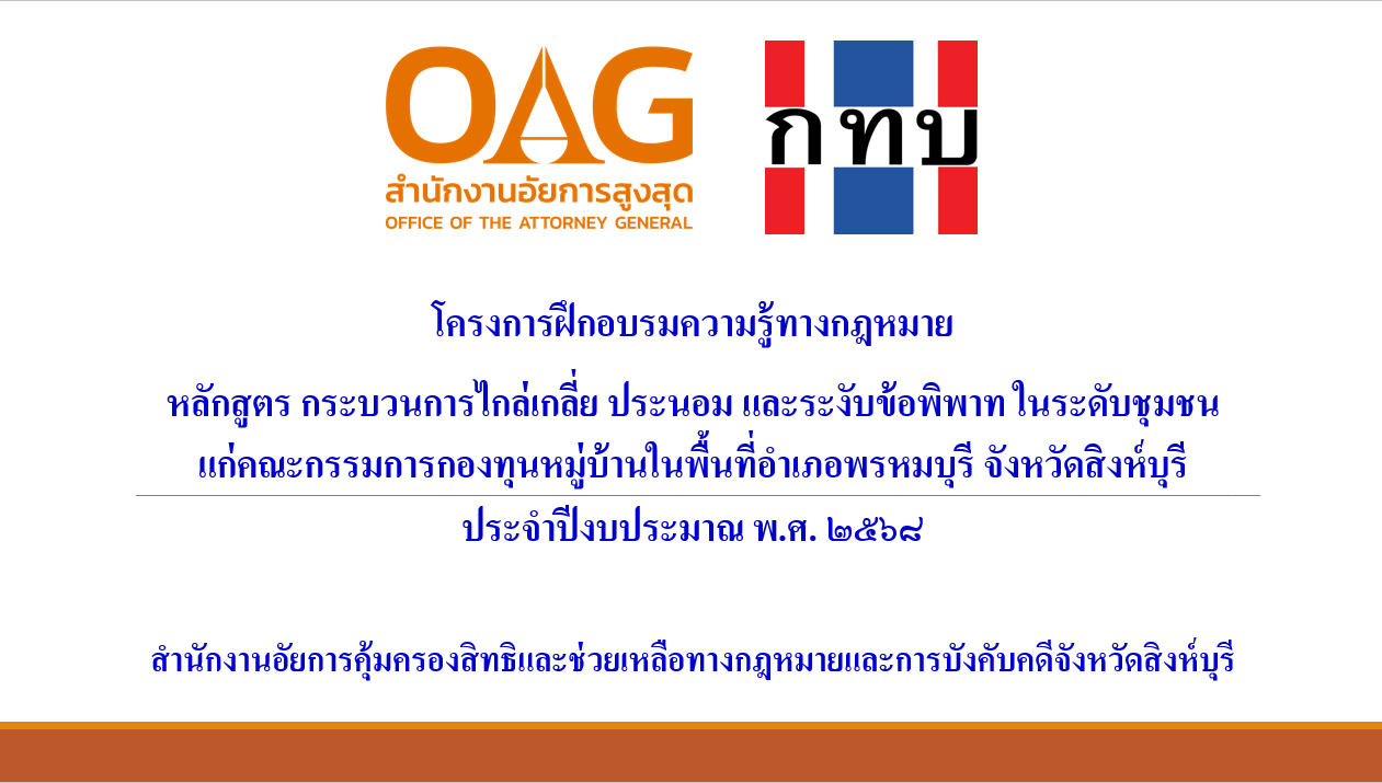 เมื่อวันอังคารที่ 24 กุมภาพันธ์ 2569 สำนักงานอัยการคุ้มครองสิทธิและช่วยเหลือทางกฎหมายและการบังคับคดีจังหวัดสิงห์บุรี เข้าร่วมโครงการอบรมความรู้ทางกฎหมาย หลักสูตร กระบวนการไกล่เกลี่ย ประนอม และระงับข้อพิพาท ในระดับชุมชน แก่คณะกรรมการกองทุนหมู่บ้านและชุมชนเมืองจังหวัดสิงห์บุรี ประจำปีงบประมาณ พ.ศ.2569 โดยบูรณาการร่วมกับเครือข่ายกองทุนหมู่บ้านและชุมชนเมืองจังหวัดสิงห์บุรี ณ ห้องประชุม ขุนสรรค์ พันเรือน ชั้น 5 ศาลากลางจังหวัดสิงห์บุรี ตำบลบางมัญ อำเภอเมืองสิงห์บุรี จังหวัดสิงห์บุรี