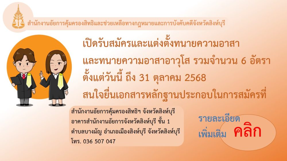 ประกาศสำนักงานอัยการคุ้มครองสิทธิและช่วยเหลือทางกฎหมายและการบังคับคดีจังหวัดสิงห์บุรี เรื่อง ประกาศรายชื่อผู้ได้รับการคัดเลือกเป็นทนายความอาสา คลิก…