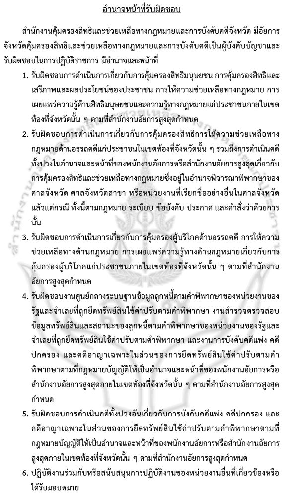 - รับรู้ ดูแล แก้ปัญหาในการคุ้มครองสิทธิ เสรีภาพ และเป็นที่พึ่งของประชาชนในด้านกฎหมาย