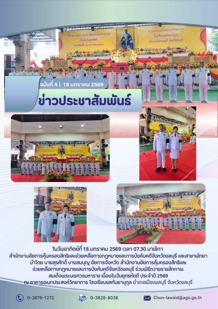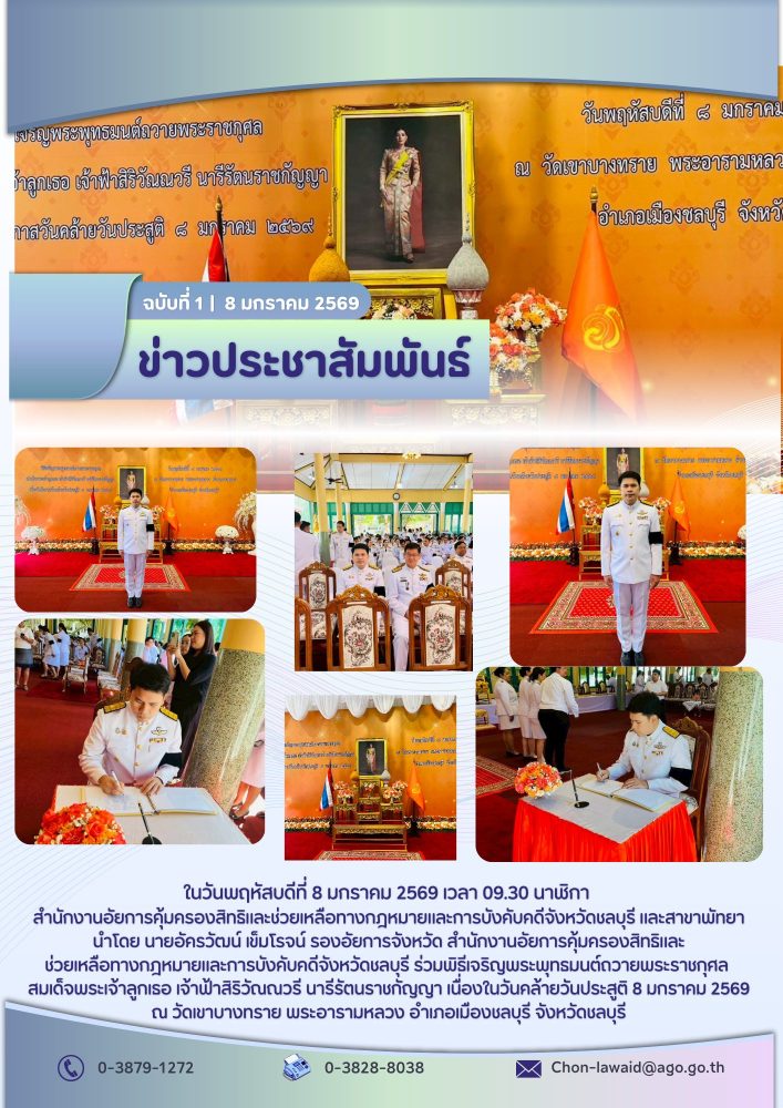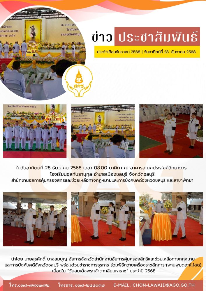 ในวันศุกร์ที่ 5 ธันวาคม 2568 เวลา 06.30 น. ณ หอพระพุทธสิหิงค์ฯ อำเภอเมืองชลบุรี จังหวัดชลบุรี และ เวลา 08.30 น. ณ สนามหน้า ศาลากลางจังหวัดชลบุรี อำเภอเมืองชลบุรี จังหวัดชลบุรี สำนักงานอัยการคุ้มครองสิทธิและช่วยเหลือทางกฎหมายและการบังคับคดีจังหวัดชลบุรี นำโดย นายสุรศักดิ์ บางสมบุญ อัยการจังหวัดสำนักงานอัยการคุ้มครองสิทธิและช่วยเหลือทางกฎหมายและการบังคับคดีจังหวัดชลบุรี ร่วมพิธีเจริญพระพุทธมนต์และทำบุญตักบาตร พิธีวางพานพุ่มดอกไม้ถวายราชสักการะ เนื่องในวันคล้ายวันพระบรมราชสมภพ