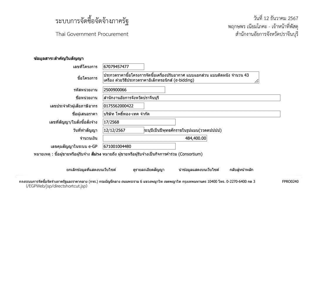 ประกาศเผยแพร่สาระสำคัญของสัญญาโครงการจัดซื้อเครื่องปรับอากาศแบบแยกส่วนแบบติดผนัง จำนวน 43 เครื่อง