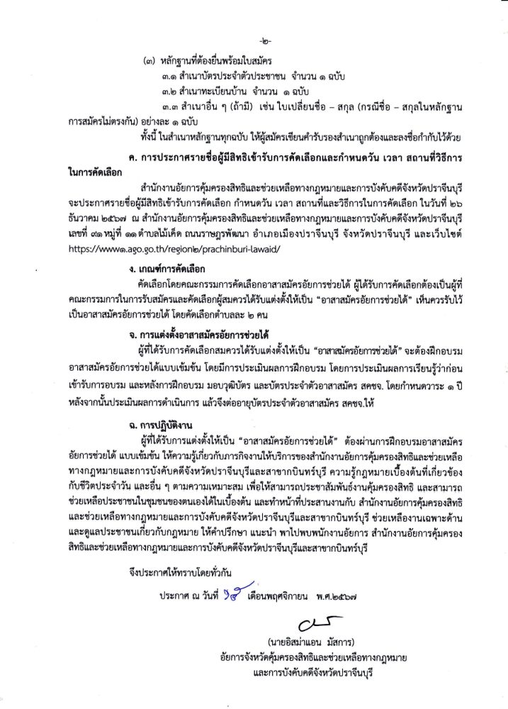 ด้วยสำนักงานอัยการคุ้มครองสิทธิและช่วยเหลือทางกฎหมายและการบังคับคดีจังหวัดปราจีนบุรีและสาขากบินทร์บุรี มีความประสงค์จะรับสมัครประชาชนทั่วไปที่มีจิตอาสา สมัครใจ เสียสละและอุทิศตน เพื่อช่วยเหลืองานด้านการคุ้มครองสิทธิและช่วยเหลือทางกฎหมายแก่ประชาชน ในเขตพื้นที่เป็น “อาสาสมัครอัยการช่วยได้” โดยสามารถสมัครด้วยตนเอง ณ สคชจ.ปราจีนบุรีและสาขากบินทร์บุรี หรือส่งใบสมัครมายัง สคชจ.ปราจีนบุรี ภายในวันที่ 20 ธันวาคม 2567 และสามารถสอบถามข้อมูลเพิ่มเติมได้ที่ 0 3748 2400