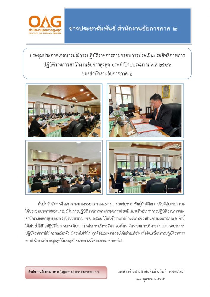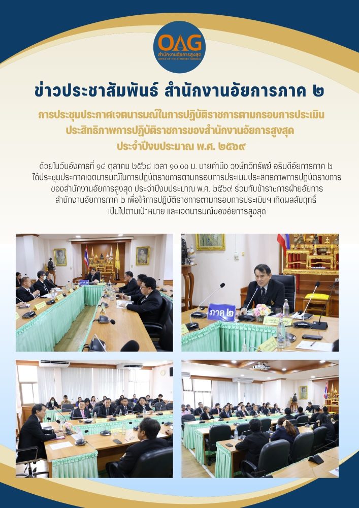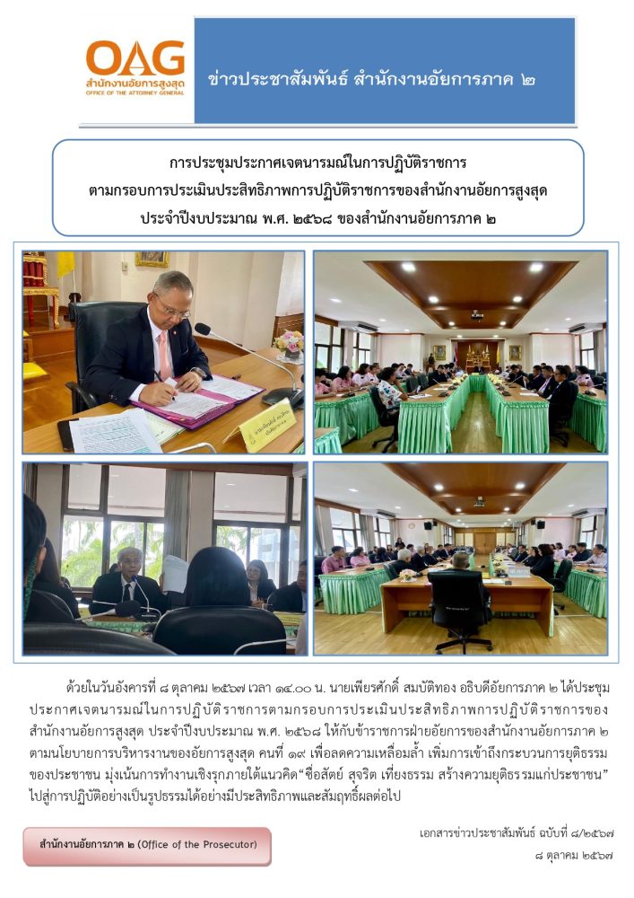 ในวันอังคารที่ ๑๒ มีนาคม ๒๕๖๔ เวลา ๑๐.๐๐ นาฬิกา ท่านสุรัตน์ มังคุด อธิบดีอัยการภาค ๒ จัดให้มีการประชุมร่วมกันกับข้าราชการฝ่ายอัยการและบุคลากรภายในสำนักงานอัยการภาค ๒ เพื่อชี้แจงการดำเนินงานตามกรอบการประเมินประสิทธิภาพการปฏิบัติราชการของสำนักงานอัยการสูงสุดประจำปี พ.ศ.๒๕๖๔ และลงนามในหนังสือการสืบสานเจตนารมณ์การปฏิบัติราชการตามกรอบการประเมินประสิทธิภาพการปฏิบัติราชการของสำนักงานอัยการสูงสุดประจำปี ๒๕๖๔ เพื่อให้การปฏิบัติราชการดังกล่าวสำเร็จลุล่วงและมีประสิทธิภาพตามที่อัยการสูงสุดกำหนด