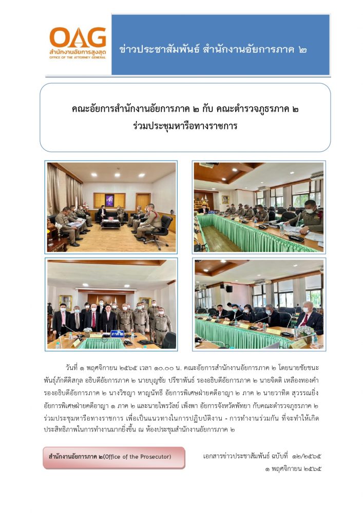 ด้วยในวันอังคารที่  ๓ พฤษภาคม  ๒๕๖๕   สำนักงานอัยการภาค ๒ ได้จัดให้มีการประชุมรับมอบนโยบายแผนการตรวจราชการของสำนักงานอัยการสูงสุด ประจำปีงบประมาณ พ.ศ. ๒๕๖๕ โดย ท่านเชาวลิต วงศานรเศรษฐ์ ผู้ตรวจการการอัยการ รับฟังนโยบายการบริหารงานของผู้บริหาร และรับฟังปัญหาอุปสรรค/ข้อเสนอแนะจากรองอธิบดีอัยการภาค ๒ อัยการพิเศษฝ่ายของสำนักงานอัยการภาค ๒ สำนักงานคดีปกครองระยองสำนักงานคดีศาลสูงภาค ๒สำนักงานคดีแรงงานภาค ๒ สำนักงานคดีปราบปรามการทุจริตภาค ๒และสำนักงานอัยการคุ้มครองสิทธิและช่วยเหลือทางกฎหมายภาค ๒ โดยผู้เข้าร่วมประชุมประกอบด้วย อัยการจังหวัด อัยการจังหวัดคดีศาลแขวง อัยการจังหวัดคดีเยาวชนฯ และอัยการจังหวัดคุ้มครองสิทธิฯ ภายในพื้นที่ภาค ๒  โดยมีวัตถุประสงค์เพื่อให้ผู้เข้าร่วมประชุมรับทราบนโยบายและนำไปปฏิบัติเพื่อรองรับการทำงานเชิงรุกและตอบสนองนโยบายของท่านอัยการสูงสุดเป็นสำคัญ ทั้งนี้ การจัดกิจกรรมดังกล่าวได้ปฏิบัติตามมาตรการป้องกันการเผยแพร่ระบาดของโรคติดเชื้อไวรัสโคโรน่า-๒๐๑๙ (COVID-19) อย่างเคร่งครัด