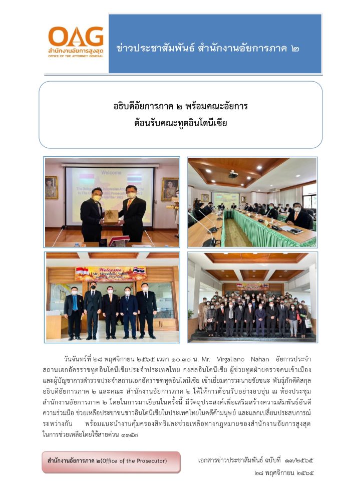 ผู้ช่วยทูตฝ่ายกิจการกฎหมายแห่งสถานเอกอัครราชทูตอินโดนีเซียประจำประเทศไทยและคณะเข้าเยี่ยมเยือนอธิบดีอัยการภาค ๒ และคณะ