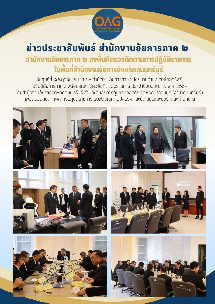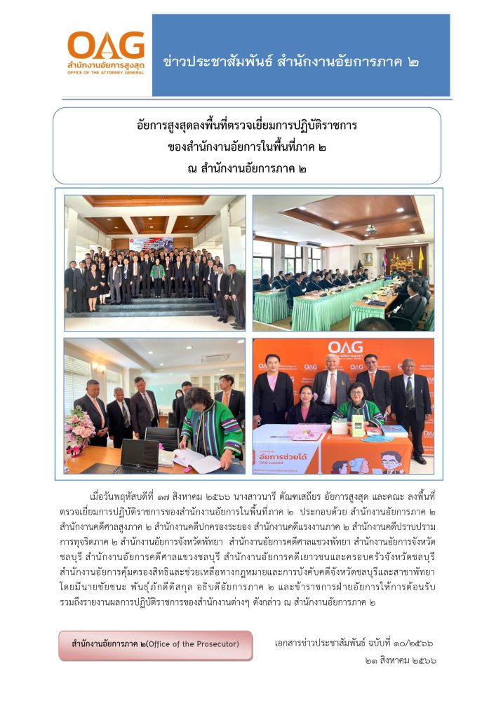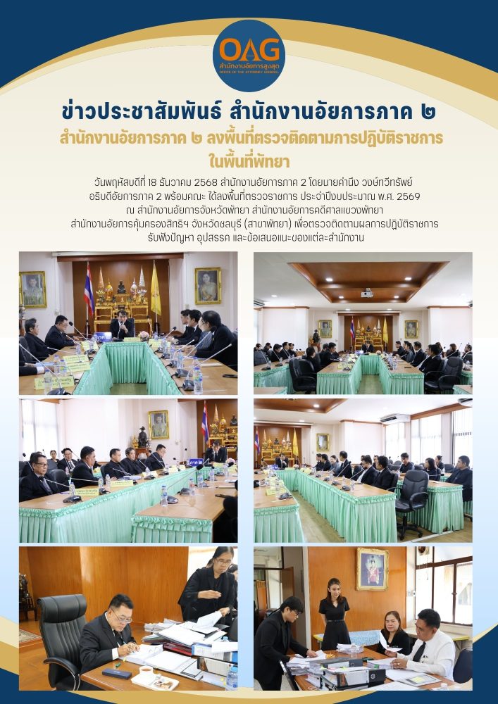 ในวันอังคารที่  ๒  มีนาคม ๒๕๖๔  เวลา ๐๙.๐๐ นาฬิกา ท่าน ปรเมศวร์ อินทรชุมนุม ผู้ตรวจการอัยการ และคณะตรวจราชการ ณ สำนักงานอัยการภาค ๒ สำนักงานอัยการคดีศาลสูงภาค ๒ สำนักงานอัยการจังหวัดพัทยา และสำนักงานอัยการคดีศาลแขวงพัทยา เพื่อเป็นการติดตามและเร่งรัดการปฏิบัติราชการให้เป็นไปตามนโยบายของสำนักงานอัยการสูงสุด พร้อมทั้งรับฟังปัญหาอุปสรรคและข้อเสนอแนะในการปฏิบัติราชการของผู้บริหาร และบุคลกรภายในหน่วยงาน