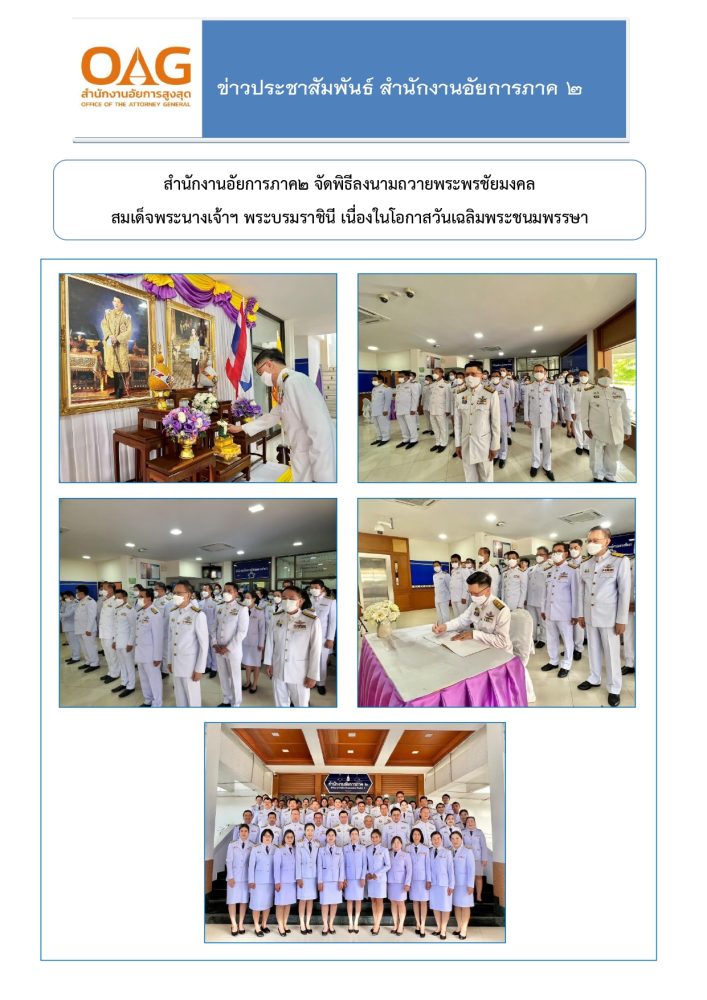 ด้วยสำนักงานอัยการภาค ๒ จัดให้มีกิจกรรมวันเฉลิมพระเกียรติสมเด็จพระนางเจ้าฯ พระบรมราชินี เนื่องในโอกาสวันเฉลิมพระชนมพรรษา ๓ มิถุนายน ๒๕๖๕ โดยจัดตั้งโต๊ะหมู่ประดิษฐานพระฉายาลักษณ์สมเด็จพระนางเจ้าฯ พระบรมราชินี พร้อมเครื่องราชสักการะ รวมทั้งตกแต่งสถานที่ ประดับธงชาติคู่กับธงอักษรพระนามาภิไธย ส.ท.  และประดับผ้าระบายสีม่วง ร่วมกับผ้าระบายสีขาว ณ บริเวณรอบรั้วอาคารสำนักงานอัยการภาค ๒