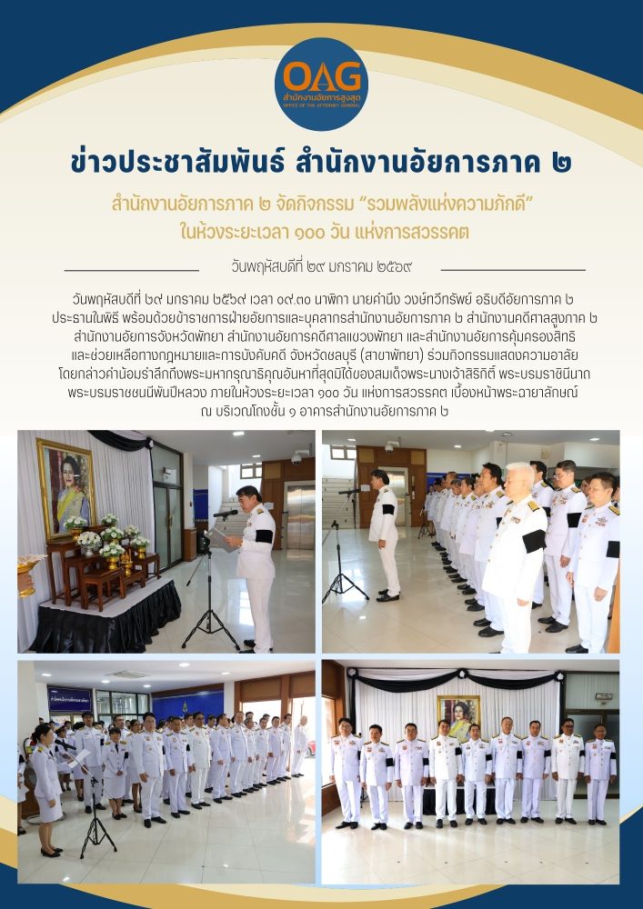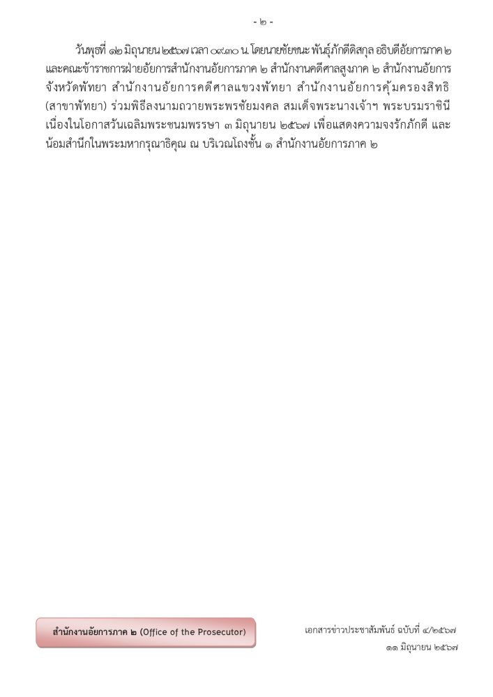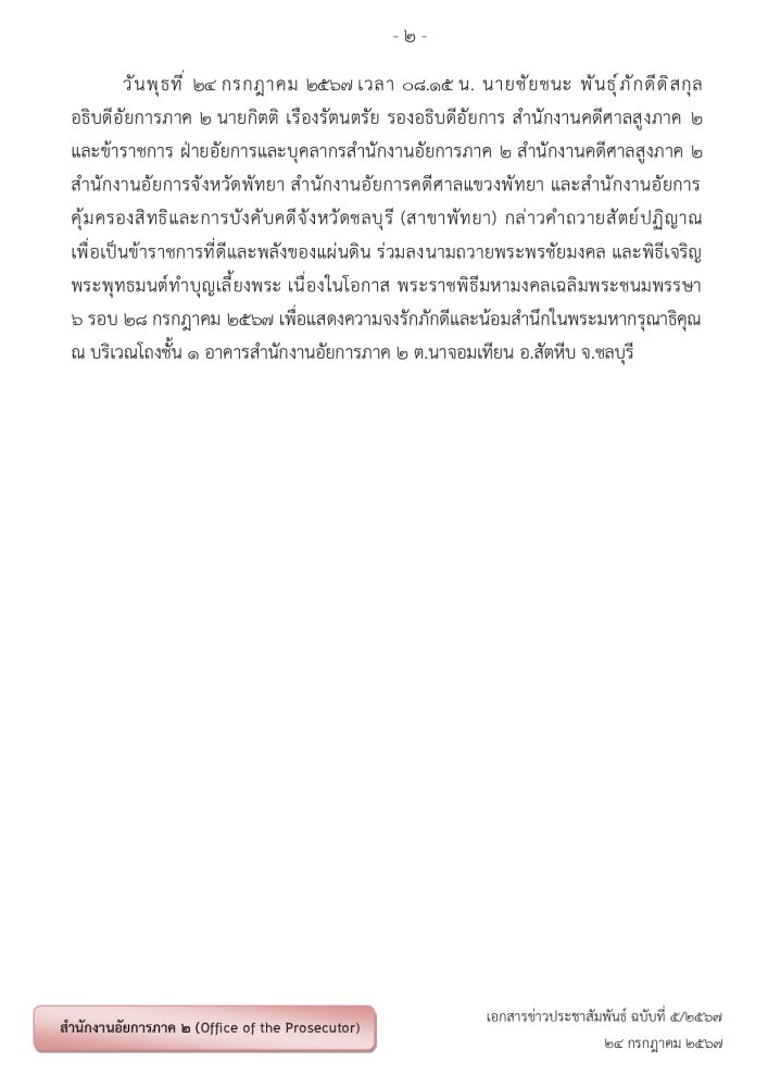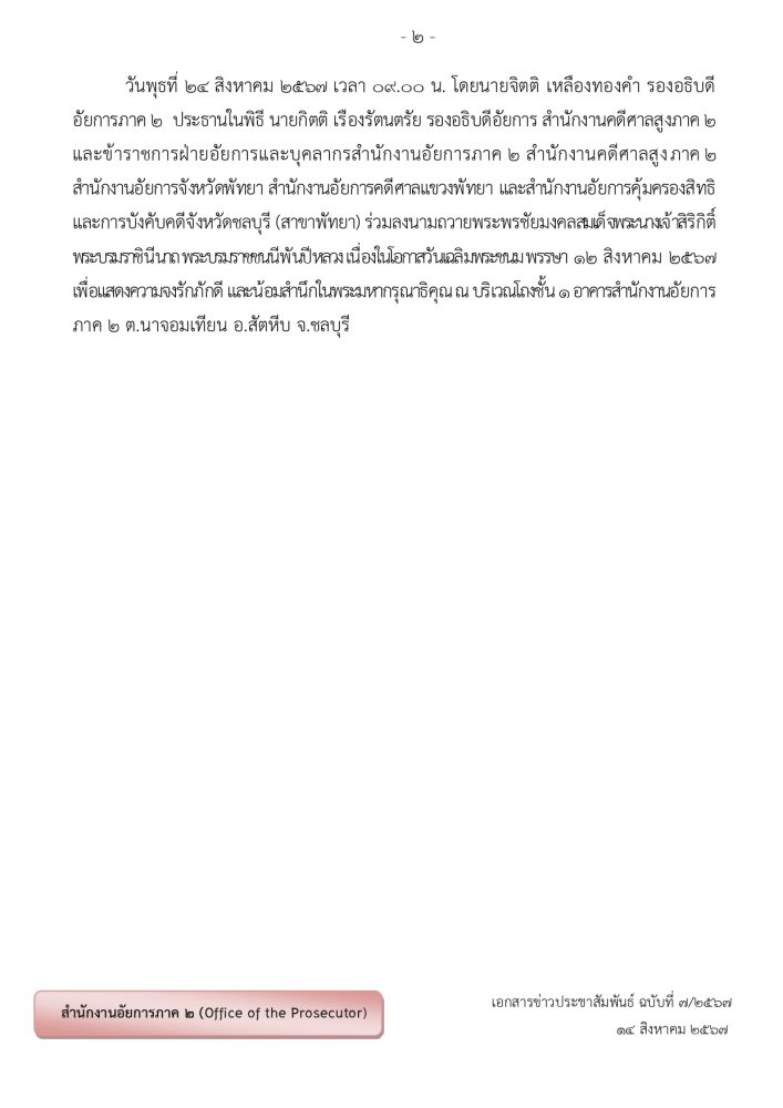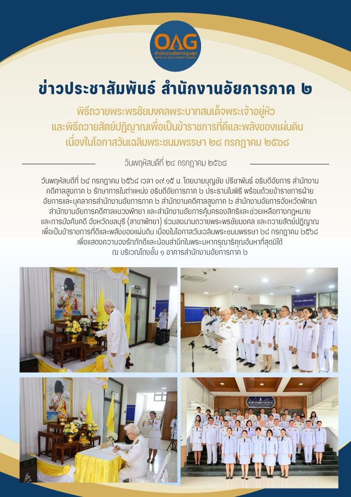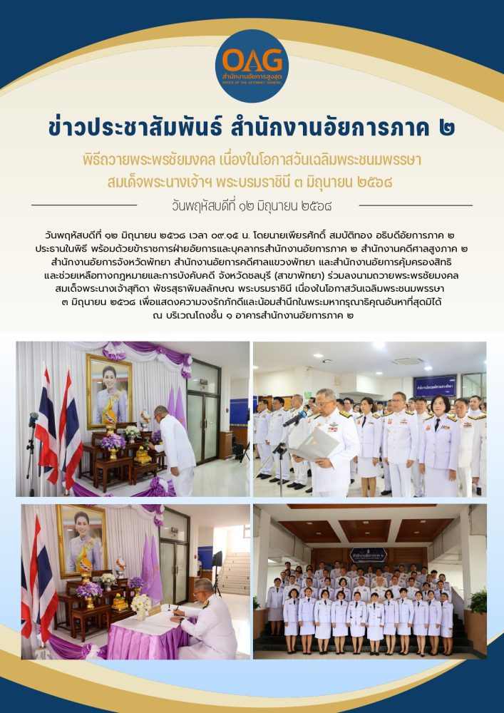 ในวันพฤหัสบดีที่ ๒๑ กรกฎาคม ๒๕๖๕ เวลา 0๙.00 น. นายสมใจ  โตศุกลวรรณ์ อธิบดีอัยการภาค ๒ เป็นประธานในพิธีถวายพระพรชัยมงคล  เนื่องในวันเฉลิมพระชนมพรรษา ๒๘ กรกฎาคม ๒๕๖๕ เพื่อแสดงออกถึงความจงรักภักดีและสำนึกในพระมหากรุณาธิคุณของพระบาทสมเด็จพระเจ้าอยู่หัว โดยมีคณะผู้บริหาร ข้าราชการฝ่ายอัยการของสำนักงานอัยการภาค ๒ สำนักงานคดีศาลสูงภาค ๒ สำนักงานอัยการจังหวัดพัทยา สำนักงานอัยการคดีศาลแขวงพัทยา และสำนักงานคุ้มครองสิทธิฯ สาขาพัทยา เข้าร่วมพิธีโดยพร้อมเพรียงกัน ณ บริเวณหน้ามุขชั้น ๑  อาคารสำนักงานอัยการภาค ๒