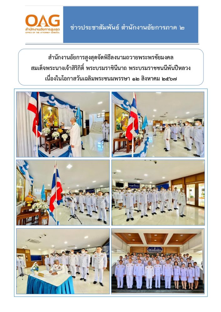 วันที่ ๑ สิงหาคม ๒๕๖๔ นายสุรัตน์ มังคุด อธิบดีอัยการภาค ๒ ข้าราชการฝ่ายอัยการและบุคลากรสำนักงานอัยการภาค ๒ ขอถวายความจงรักภักดีและสำนึกในพระมหากรุณาธิคุณสมเด็จพระนางเจ้าสิริกิติ์ พระบรมราชินีนาถ พระบรมราชชนนีพันปีหลวง เนื่องในโอกาสวันเฉลิมพระชนมพรรษา ๑๒ สิงหาคม ๒๕๖๔ โดยจัดตั้งโต๊ะหมู่ประดิษฐานพระฉายาลักษณ์สมเด็จพระนางเจ้าสิริกิติ์ พระบรมราชินีนาถ พระบรมราชชนนีพันปีหลวง พร้อมเครื่องราชสักการะ รวมทั้งตกแต่งสถานที่ ประดับธงชาติคู่กับธงอักษรพระนามาภิไธย ส.ก. และประดับผ้าระบายสีฟ้า ร่วมกับผ้าระบายสีขาว ณ บริเวณรอบรั้วอาคารสำนักงานอัยการภาค ๒ ระหว่างวันที่ ๑ – ๑๕ สิงหาคม ๒๕๖๔ เนื่องในวันเฉลิมพระชนมพรรษาสมเด็จพระนางเจ้าสิริกิติ์ พระบรมราชินีนาถ พระบรมราชชนนีพันปีหลวง ๑๒ สิงหาคม ๒๕๖๔