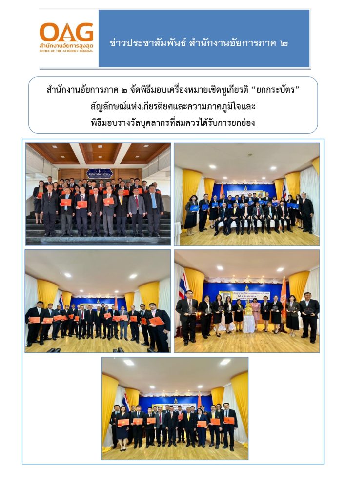 พิธีมอบโล่และเกียรติบัตรพร้อมเงินรางวัลในโครงการประกวดคลิปวิดีโอ (Video Clip) เผยแพร่ความรู้ทางกฎหมายของสำนักงานอัยการพิเศษฝ่ายคุ้มครองสิทธิและช่วยเหลือทางกฎหมายภาค ๒ ณ สำนักงานอัยการภาค