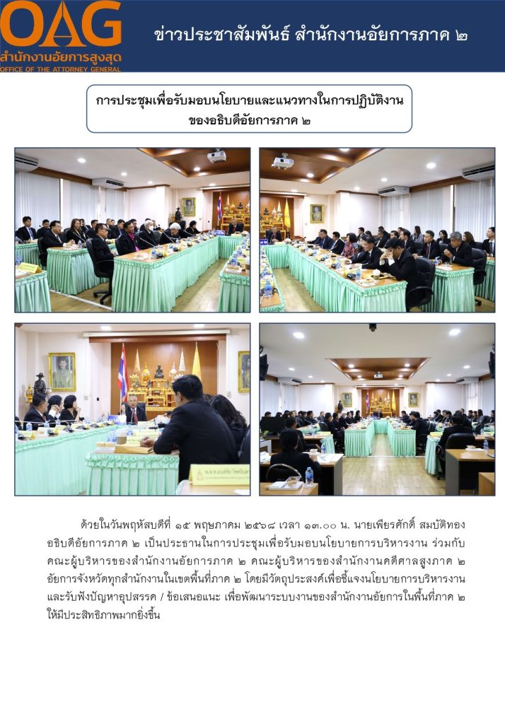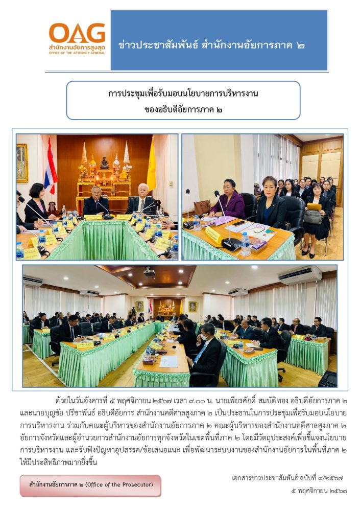 ข้าราชการฝ่ายอัยการ สำนักงานอัยการภาค ๒ เข้าร่วมประชุมเพื่อรับมอบนโยบายการบริหารงานจากท่านอธิบดีอัยการภาค ๒