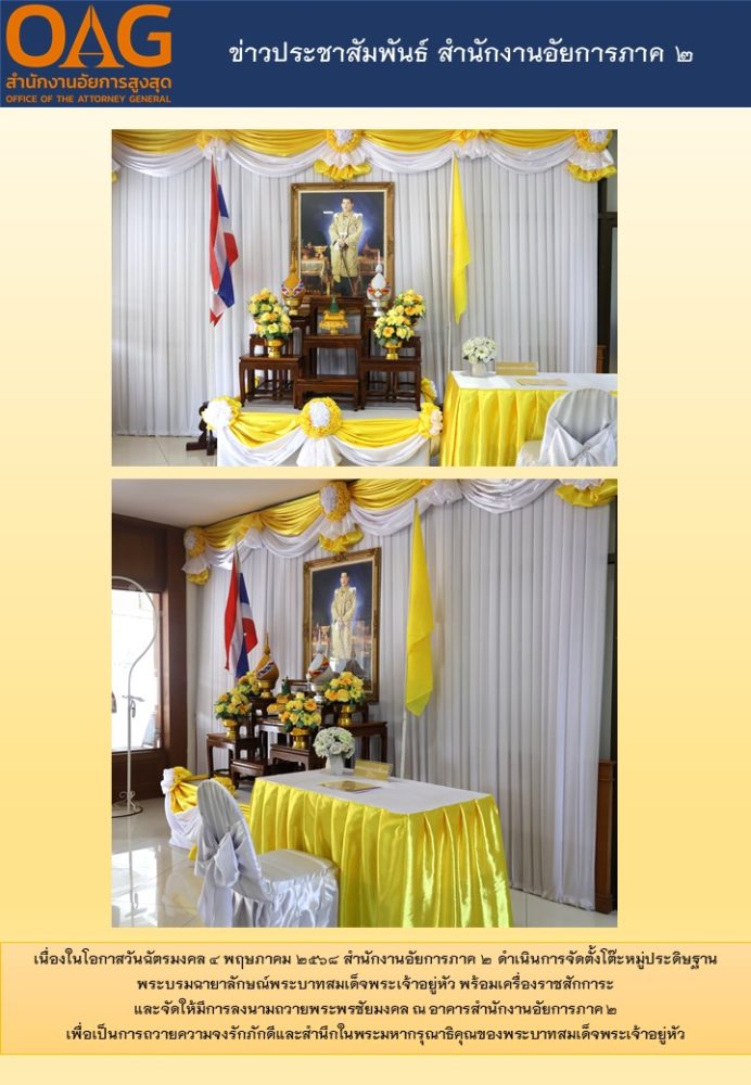 สำนักงานอัยการภาค ๒ ตกแต่งสถานที่ประดับพระบรมฉายาลักษณ์พร้อมเครื่องราชสักการะ เนื่องในโอกาสวันเฉลิมพระชนมพรรษาพระบาทสมเด็จพระเจ้าอยู่หัว ๒๘ กรกฎาคม ๒๕๖๔
