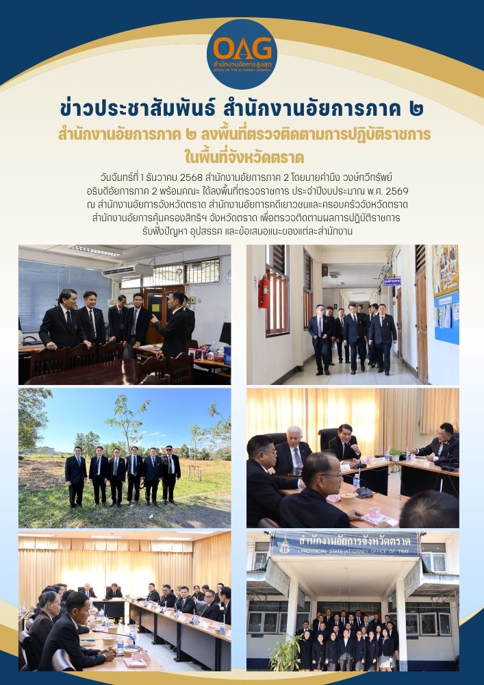 ในวันอังคารที่ ๑๓ กรกฎาคม ๒๕๖๔ เวลา ๐๙.๓๐ น. – ๑๒.๐๐ น. สำนักงานอัยการภาค ๒ได้จัดให้มีการตรวจราชการประจำปี พ.ศ. ๒๕๖๔ ผ่านระบบสื่อทางไกลออนไลน์ ในพื้นที่จังหวัดตราด และจังหวัดจันทบุรี โดยมีนายสุรัตน์  มังคุด อธิบดีอัยการภาค ๒ นายเพียรศักดิ์  สมบัติทอง รองอธิบดีอัยการภาค ๒นางวิชญา  หาญนัทธี  อัยการพิเศษฝ่ายคดีอาญา ๒ ภาค ๒ นางสาวรัชนีกร  สายสมร ผู้อำนวยการ สำนักอำนวยการ สำนักงานอัยการภาค  ๒  และคณะ ซึ่งก่อนการจัดประชุมฯ สำนักงานอัยการภาค ๒ ได้มีการเรียกสำนวนมาตรวจสอบ การตรวจสอบสารบบอิเล็กทรอนิกส์  การตรวจสอบเอกสารงานบริหาร งานการเงินฯ และงานพัสดุ ล่วงหน้าแล้ว และในการประชุมได้มีการสรุปประเด็นปัญหาอุปสรรคและข้อเสนอแนะต่าง ๆ ในเรื่องของงานคดี งานบริหาร งานการเงินฯ และงานพัสดุดังกล่าว และสำนักงานอัยการภาค ๒ จะดำเนินการตรวจราชการผ่านระบบออนไลน์ของสำนักงานอัยการต่าง ๆ ภายในภาค ๒ ในระหว่างวันที่ ๑๔ – ๑๕ กรกฎาคม ๒๕๖๔ และระหว่างวันที่ ๒๐ – ๒๒ กรกฎาคม ๒๕๖๔ ต่อไป