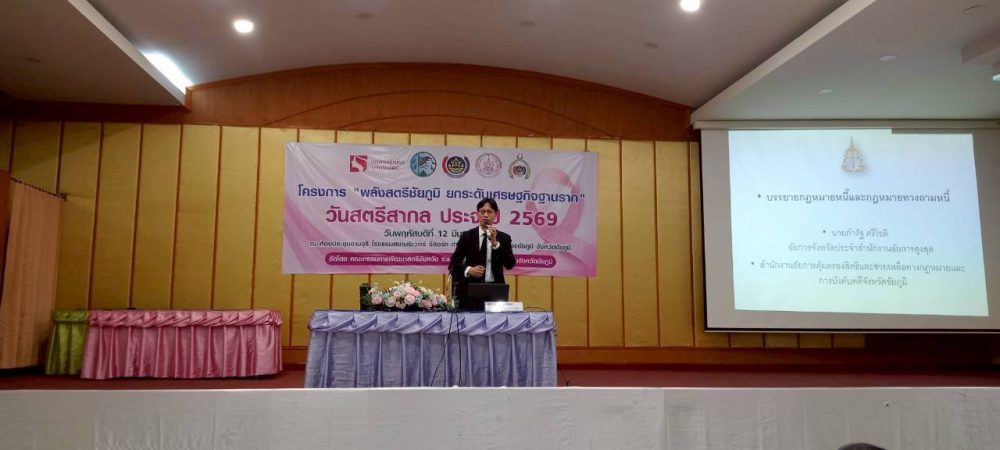 วันพฤหัสบดีที่ ๑๒ มีนาคม ๒๕๖๙ เวลา ๐๘.๐๐ – ๑๖.๐๐ น. นายกำรัฐ ศรีโชติ อัยการจังหวัดประจำสำนักงานอัยการสูงสุด เป็นวิทยากรบรรยายในหัวข้อ “รู้เท่าทันกฎหมายทวงหนี้” โครงการ “พลังสตรีชัยภูมิ ยกระดับเศรษฐกิจฐานราก” ณ ห้องประชุมจามจุรี โรงแรมสยามริเวอร์รีสอร์ท ตำบลในเมือง อำเภอเมืองชัยภูมิ จังหวัดชัยภูมิ