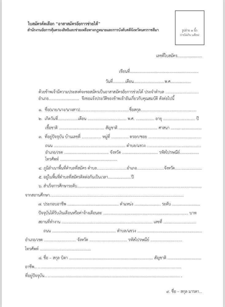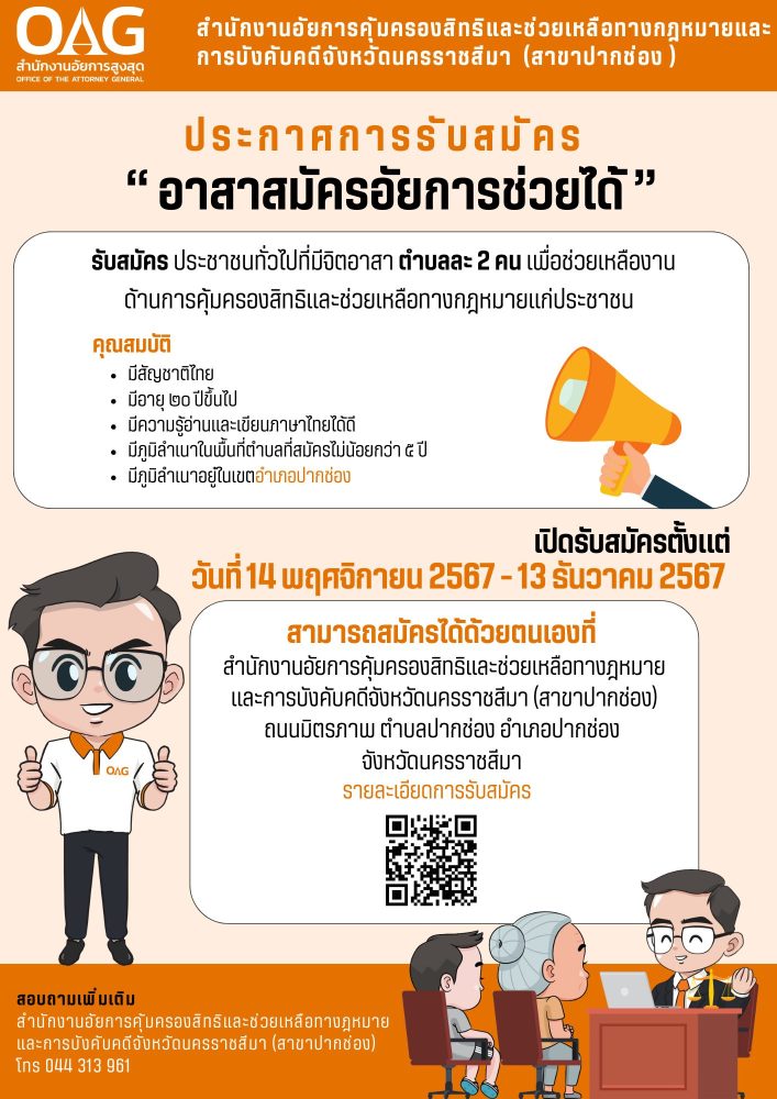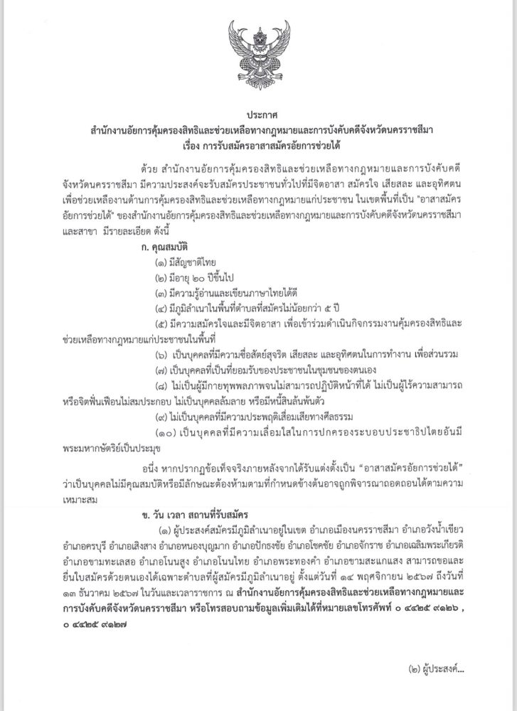 ประกาศคณะกรรมการทนายความอาสาและทนายความอาสาอาวุโสจังหวัดนครราชสีมา (กทอ.จังหวัดนครราชสีมา) เรื่อง การรับสมัครและแต่งตั้งทนายความอาสาและทนายความอาสาอาวุโส ประจำสำนักงานอัยการคุ้มครองสิทธิและช่วยเหลือทางกฎหมายและการบังคับคดี จังหวัดนครราชสีมา (สาขาปากช่อง)