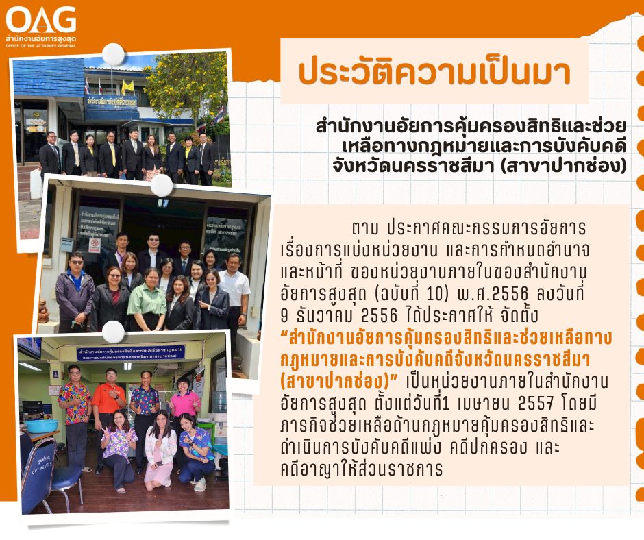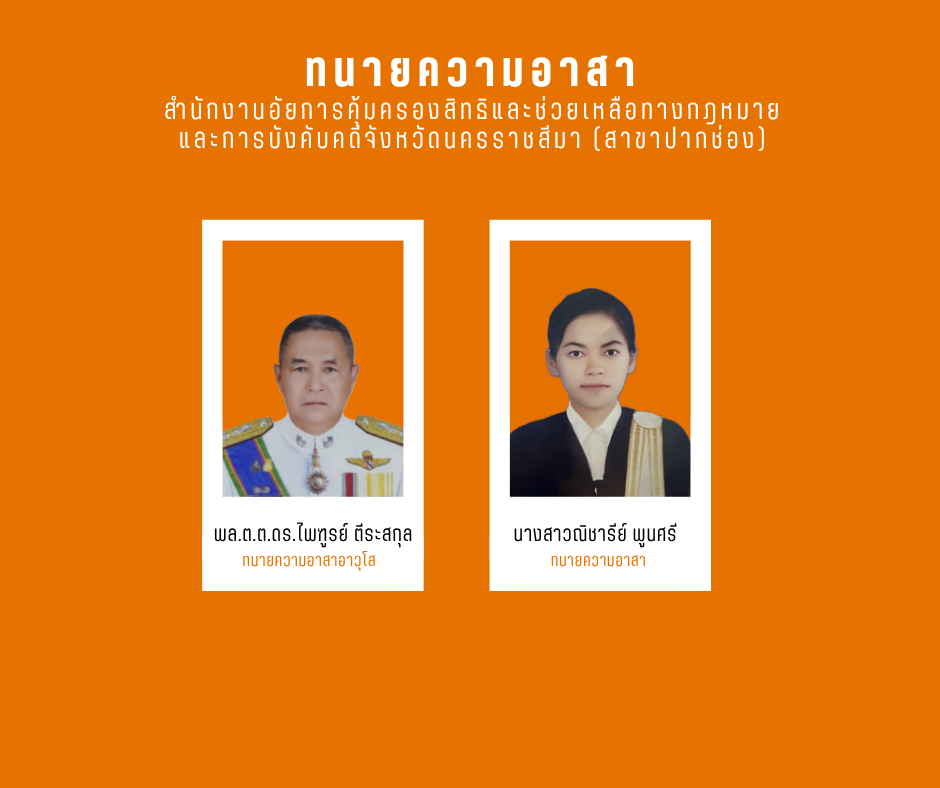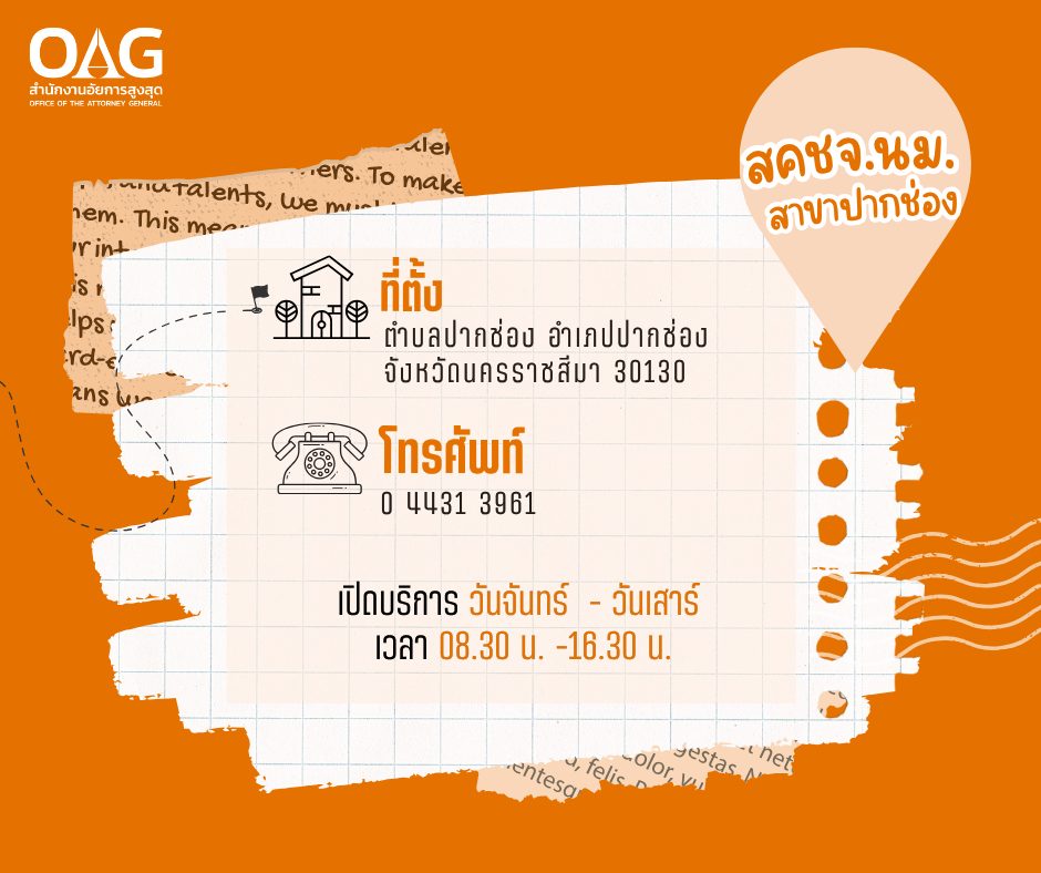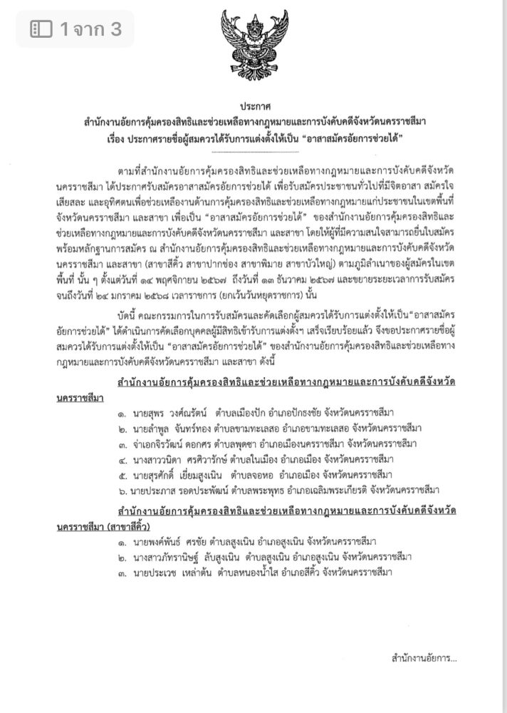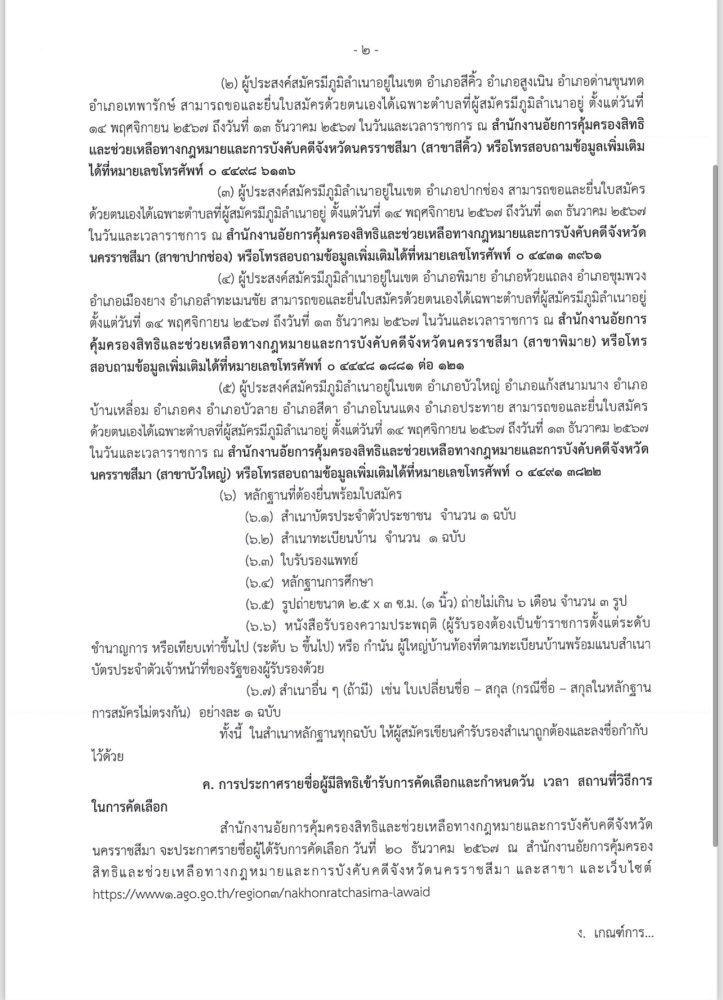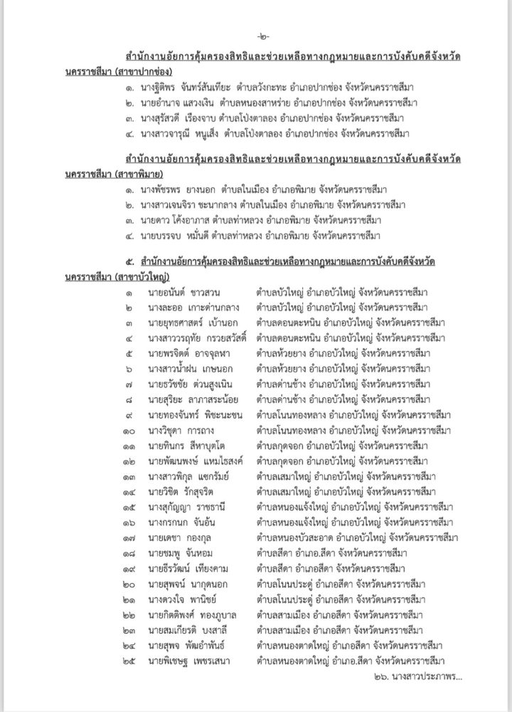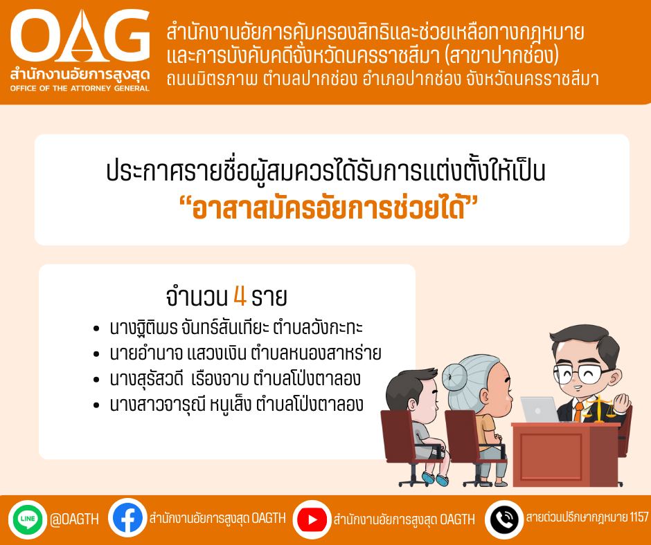 ประกาศรายชื่อผู้มีสิทธิรับการคัดเลือกทนายความอาสาและทนายความอาสาอาวุโสประจำสำนักงานอัยการ คุ้มครองสิทธิและช่วยเหลือทางกฎหมายและการบังคับคดีจังหวัดนครราชสีมา (สาขาปากช่อง)