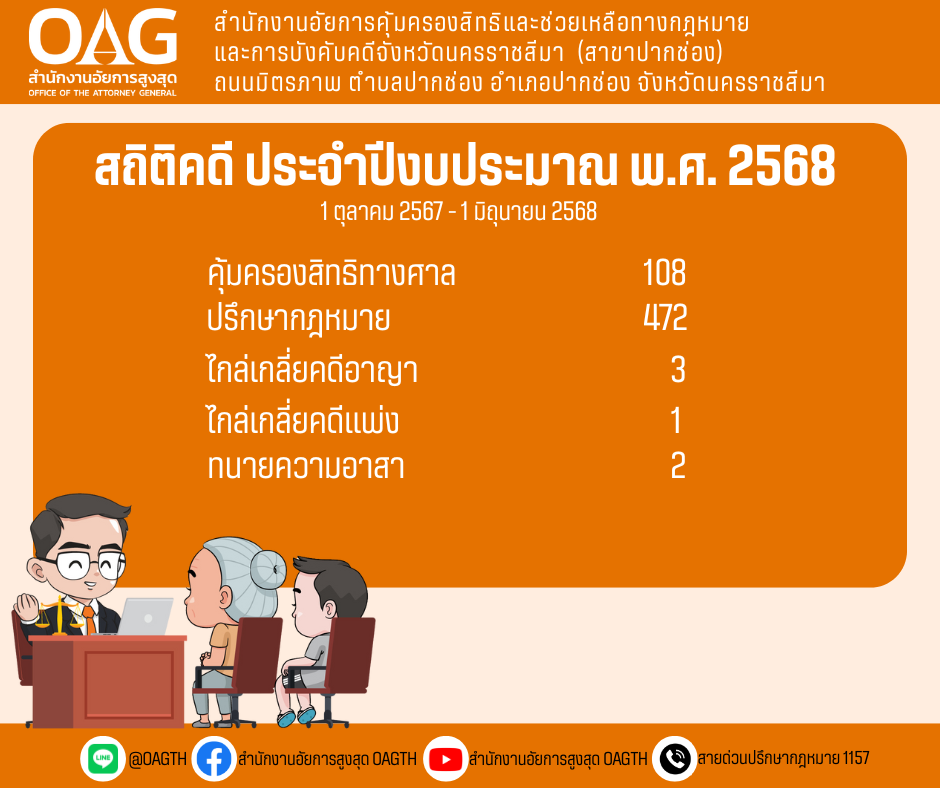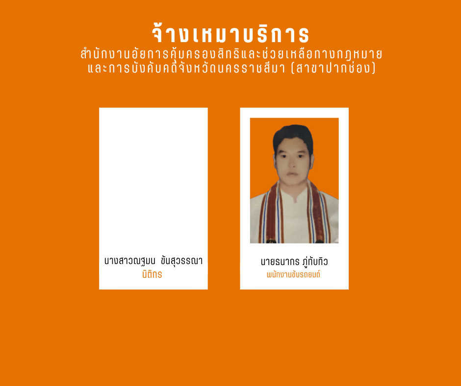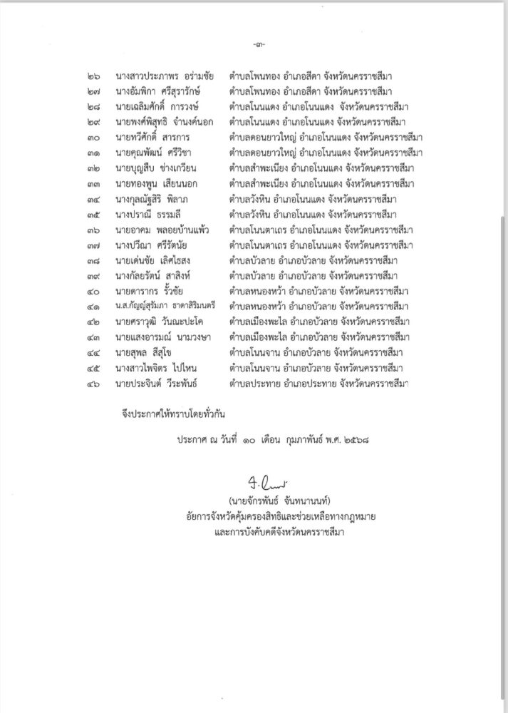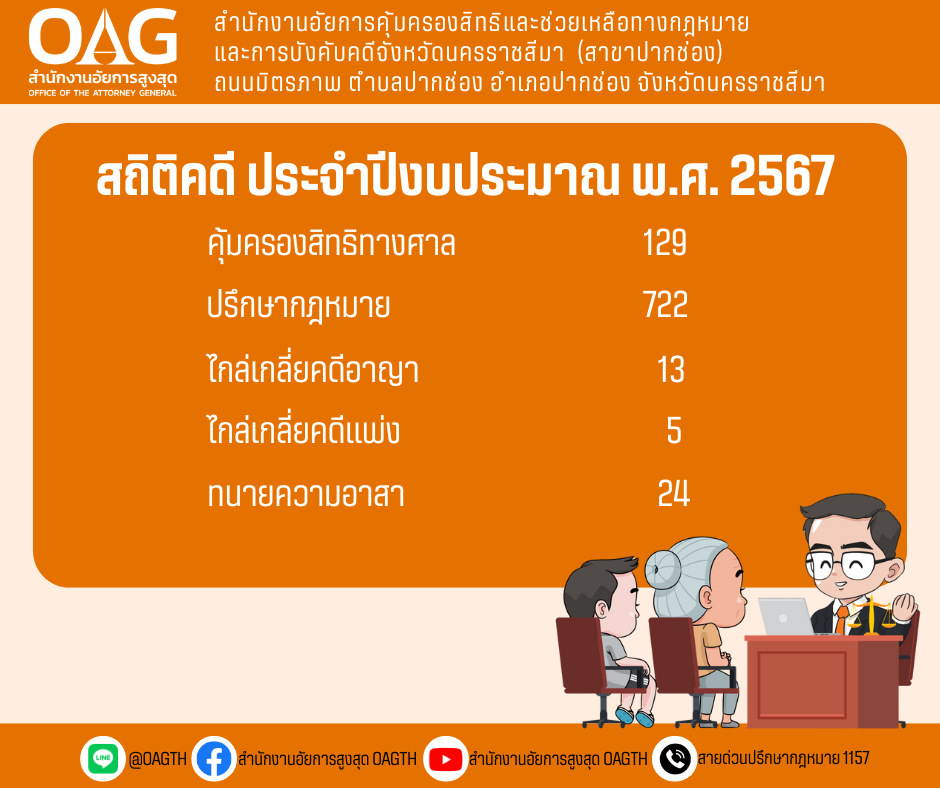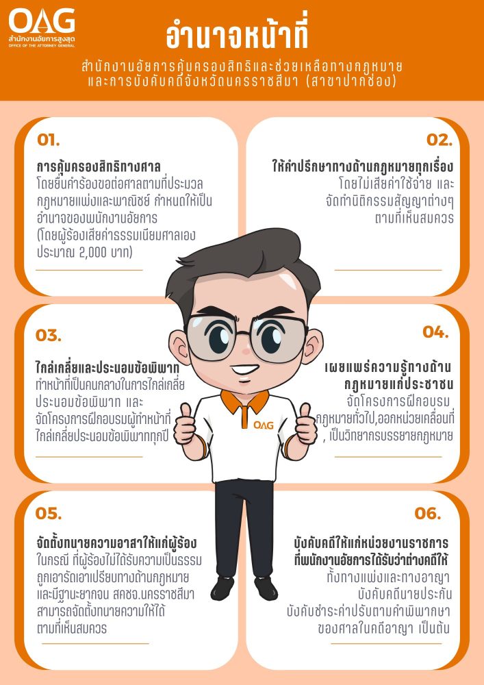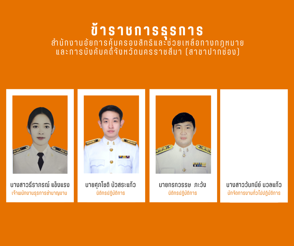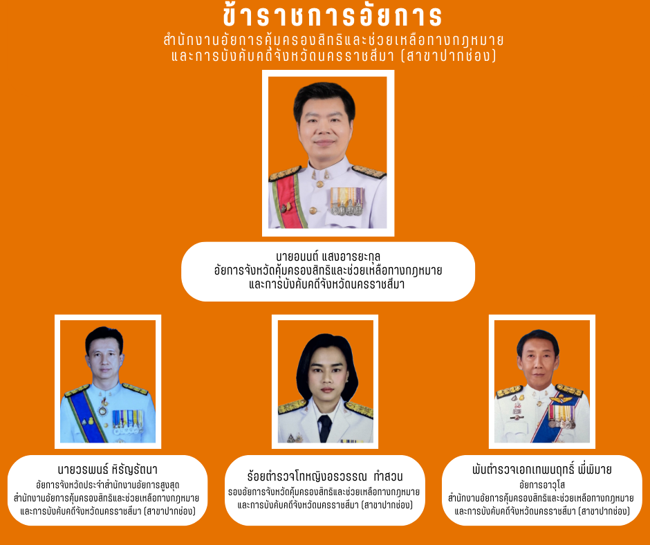ประกาศรายชื่อผู้มีสิทธิรับการคัดเลือกทนายความอาสาและทนายความอาสาอาวุโสประจำสำนักงานอัยการ คุ้มครองสิทธิและช่วยเหลือทางกฎหมายและการบังคับคดีจังหวัดนครราชสีมา (สาขาปากช่อง)