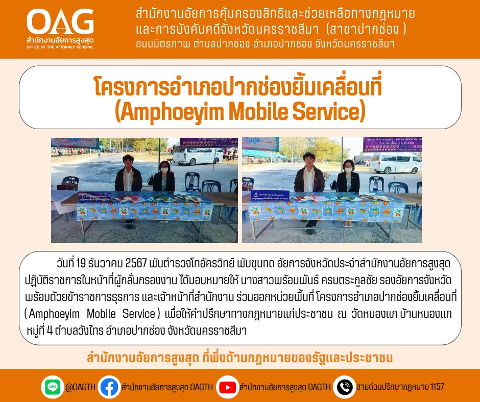วันที่ 19 ธันวาคม 2567 พันตำรวจโทอัครวิทย์ พับขุนทด อัยการจังหวัดประจำสำนักงานอัยการสูงสุด สำนักงานอัยการคุ้มครองสิทธิและช่วยเหลือทางกฎหมายและการบังคับคดีจังหวัดนครราชสีมา (สาขาปากช่อง) ปฏิบัติราชการในหน้าที่ผู้กลั่นกรองงาน มอบหมายให้ นางสาวพร้อมพันธ์ ครบตระกูลชัย รองอัยการจังหวัด พร้อมด้วยเจ้าหน้าที่สำนักงาน ร่วมออกหน่วยพื้นที่โครงการอำเภอปากช่องยิ้มเคลื่อนที่ (Amphoeyim Mobile Service) เพื่อให้คำปรึกษากฎหมายแก่ประชาชน ณ วัดหนองแก บ้านหนองแก หมู่ 4 ตำบลวังไทร อำเภอปากช่อง จังหวัดนครราชสีมา
