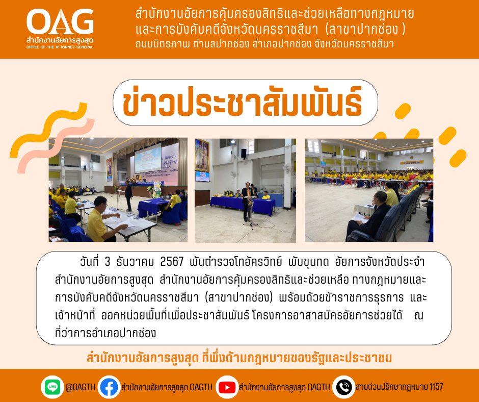 วันที่ 3 ธันวาคม 2567 พันตำรวจโทอัครวิทย์ พับขุนทด อัยการจังหวัดประจำสำนักงานอัยการสูงสุด สำนักงานอัยการคุ้มครองสิทธิและช่วยเหลือทางกฎหมายและการบังคับคดีจังหวัดนครราชสีมา (สาขาปากช่อง) ปฏิบัติราชการในหน้าที่ผู้กลั่นกรองงาน พร้อมด้วยเจ้าหน้าที่สำนักงาน ออกหน่วยพื้นที่ เพื่อประชาสัมพันธ์ โครงการอาสาสมัครอัยการช่วยได้ ณ ที่ว่าการอำเภอปากช่อง