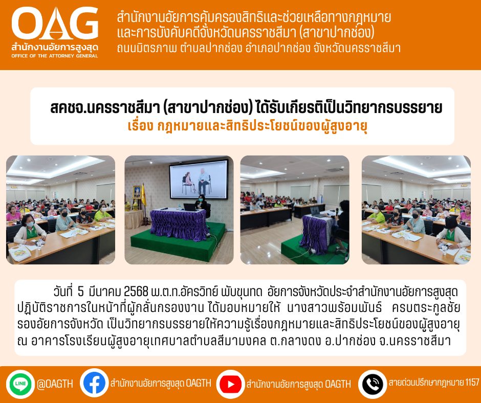 วันที่ 5 มีนาคม 2568 พันตำรวจโทอัครวิทย์ พับขุนทด อัยการจังหวัดประจำสำนักงานอัยการสูงสุด สำนักงานอัยการคุ้มครองสิทธิและช่วยเหลือทางกฎหมายและการบังคับคดีจังหวัดนครราชสีมา (สาขาปากช่อง) ปฏิบัติราชการในหน้าที่ผู้กลั่นกรองงาน มอบหมายให้นางสาวพร้อมพันธ์ ครบตระกูลชัย รองอัยการจังหวัด พร้อมด้วยเจ้าหน้าที่สำนักงานเป็นวิทยากรบรรยายให้ความรู้เรื่องกฎหมายและสิทธิประโยชน์ของผู้สูงอายุ ณ อาคารโรงเรียนผู้สูงอายุเทศบาลตำบลสีมามงคล ตำบลกลางดง อำเภปปากช่อง จังหวัดนครราชสีมา