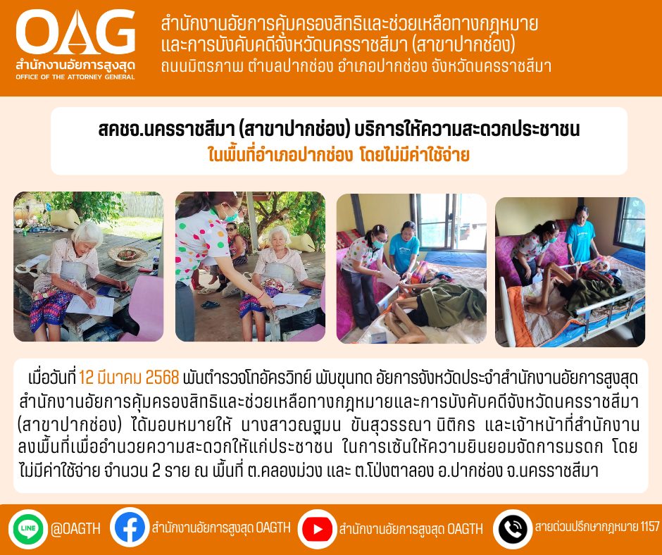 วันที่ 12 มีนาคม 2568 พันตำรวจโทอัครวิทย์ พับขุนทด อัยการจังหวัดประจำสำนักงานอัยการสูงสุด สำนักงานอัยการคุ้มครองสิทธิและช่วยเหลือทางกฎหมายและการบังคับคดีจังหวัดนครราชสีมา (สาขาปากช่อง) ปฏิบัติราชการในหน้าที่ผู้กลั่นกรองงาน มอบหมายให้ นางสาวณฐมน ขันสุวรรณา นิติกร และเจ้าหน้าที่สำนักงาน ลงพื้นที่อำนวยความสะดวกให้แก่ประชาชน ในการเซนให้ความยินยอมจัดการมรดก โดยไม่เสียค่าใช้จ่าย จำนวน 2 ราย ตำบลคลองม่วง และ ตำบลโป่งตาลอง อำเภอปากช่อง จังหวัดนครราชสีมา