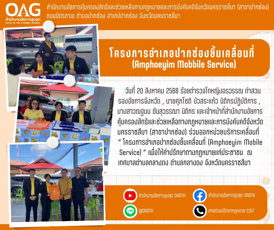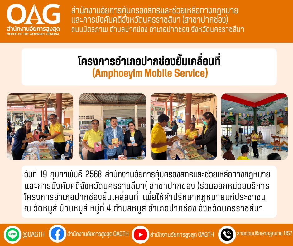 วันที่ 19 กุมภาพันธ์ 2568 พันตำรวจโทอัครวิทย์ พับขุนทด อัยการจังหวัดประจำสำนักงานอัยการสูงสุด สำนักงานอัยการคุ้มครองสิทธิและช่วยเหลือทางกฎหมายและการบังคับคดีจังหวัดนครราชสีมา (สาขาปากช่อง) ปฏิบัติราชการในหน้าที่ผู้กลั่นกรองงาน และเจ้าหน้าที่สำนักงาน ร่วมออกหน่วยพื้นที่โครงการอำเภอปากช่องยิ้มเคลื่อนที่ (Amphoeyim Mobile Service) เพื่อให้คำปรึกษากฎหมายแก่ประชาชน ณ วัดหมูสี บ้านหมูสี หมู่ที่ 4 ตำบลหมูสี อำเภปปากช่อง จังหวัดนครราชสีมา