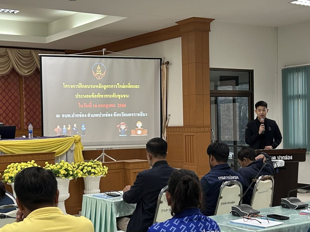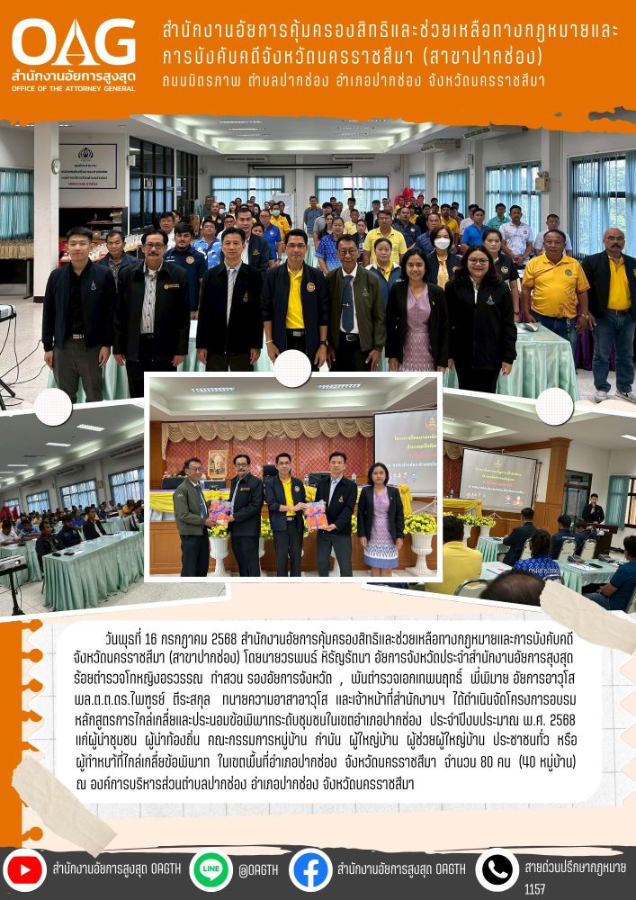 วันพุธที่ 16 กรกฎาคม 2568 สำนักงานอัยการคุ้มครองสิทธิและช่วยเหลือทางกฎหมายและการบังคับคดีจังหวัดนครราชสีมา (สาขาปากช่อง) โดยนายวรพนธ์ หิรัญรัตนา อัยการจังหวัดประจำสำนักงานอัยการสุงสุด ร้อยตำรวจโทหญิงอรวรรณ ทำสวน รองอัยการจังหวัด , พันตำรวจเอกเทพนฤทธิ์ พี่พิมาย อัยการอาวุโส พล.ต.ต.ดร.ไพฑูรย์ ตีระสกุล ทนายความอาสาอาวุโส และเจ้าหน้าที่สำนักงานฯ ได้ดำเนินจัดโครงการอบรม หลักสูตรการไกล่เกลี่ยและประนอมข้อพิพาทระดับชุมชนในเขตอำเภอปากช่อง ประจำปีงบประมาณ พ.ศ. 2568แก่ผู้นำชุมชน ผู้นำท้องถิ่น คณะกรรมการหมู่บ้าน กำนัน ผู้ใหญ่บ้าน ผู้ช่วยผู้ใหญ่บ้าน ประชาชนทั่ว หรือ ผู้ทำหนา้ที่ไกล่เกลี่ยข้อพิพาท ในเขตพื้นที่อำเภอปากช่อง จังหวัดนครราชสีมา จำนวน 80 คน (40 หมู่บ้าน) ณ องค์การบริหารส่วนตำบลปากช่อง อำเภอปากช่อง จังหวัดนครราชสีมา