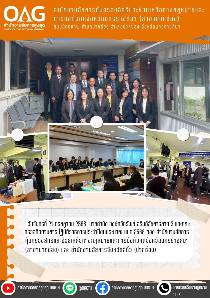 วันจันทร์ ที่ 21 กรกฎาคม 2568 นายคำนึง วงษ์ทวีทรัพย์ อธิบดีอัยการภาค 3 และคณะ ตรวจติดตามการปฏิบัติราชการประจำปีงบประมาณ พ.ศ.2568 ของสำนักงานอัยคุ้มครองสิทธิและช่วยเหลือทางกฎหมยและการบังคับคดีจังหวัดนครราชสีมา (สาขาปากช่อง) และ สำนักงานอัยการจังหวัดสีคิ้ว (ปากช่อง)