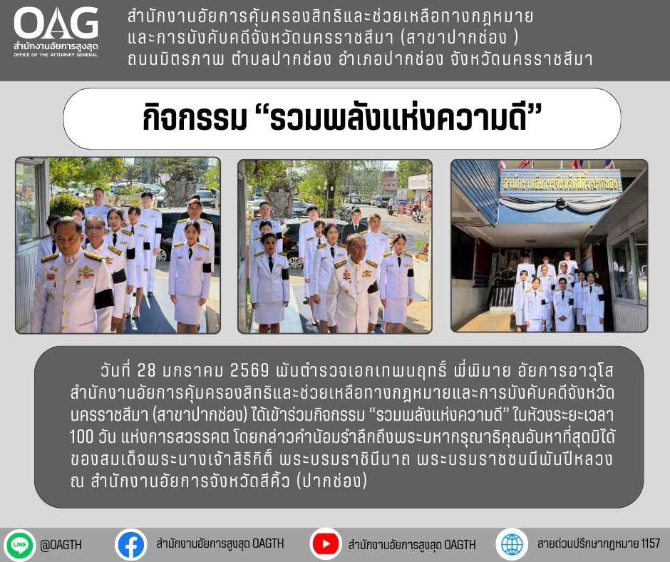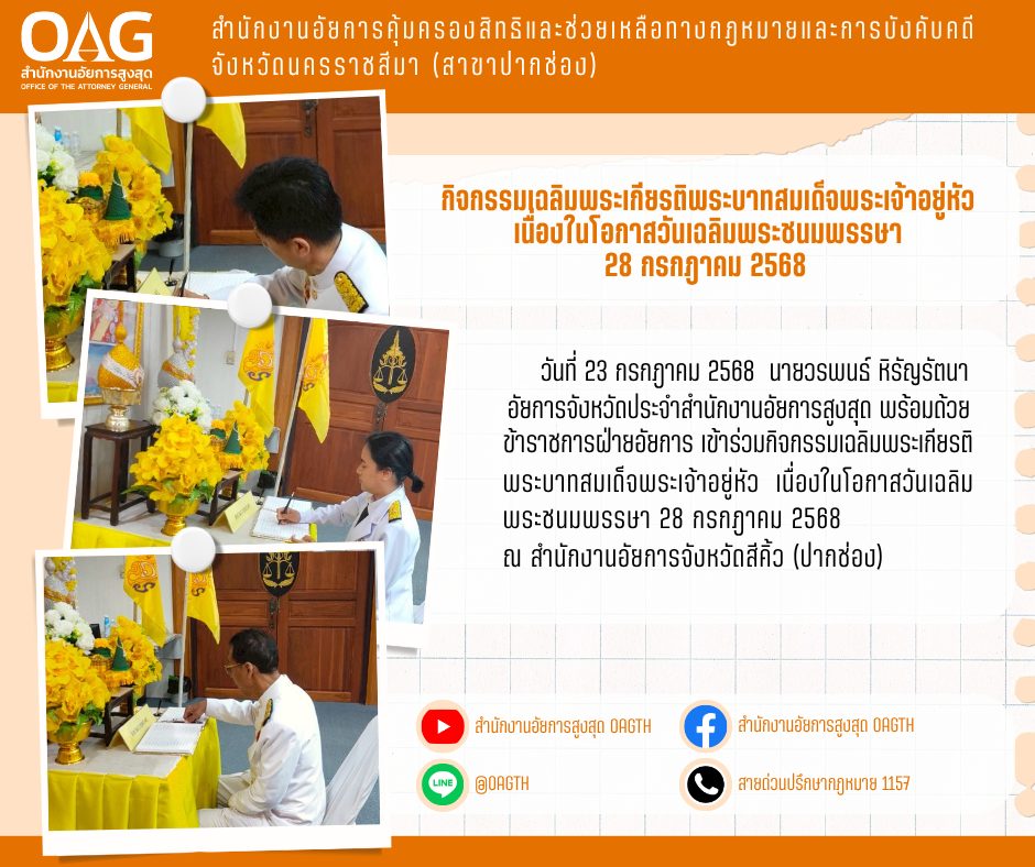 วันพุธที่ 23 กรกฎาคม 2568 นายวรพนธ์ รัญรัตนา อัยการจังหวัดประจำสำนักงานอัยการสูงสุด , ร้อยตำรวจโทหญิงอรวรรณ ทำสวน รองอัยการจังหวัด , พันตำรวจเอกเทพนฤทธิ์ พี่พมาย อัยการอาวุโส พร้อมด้วยข้าราชการฝ่ายอัยการ สำนักงานอัยการคุ้มครองสิทธิและช่วยเหลือทางกฎหมายและการบังคับคดีจังหวัดนครราชสีมา (สาขาปากช่อง) ร่วมกิจกรรมเฉลิมพระเกียรติพระบาทสมเด็จพระเจ้าอยู๋หัว เนื่องในโอกาสวันเฉลิมพระชนมพรรษา 28 กรกฎาคม 2568 ณ สำนักงานอัยการจังหวัดสีคิ้ว (ปากช่อง)
