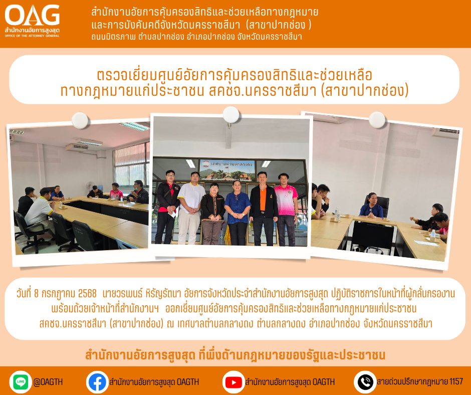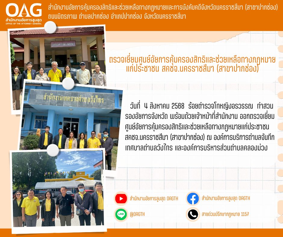 วันที่ 4 สิงหาคม 2568 ร้อยตำรวจโทหญิงอรวรรณ ทำสวน รองอัยการจังหวัดสีคิ้ว ช่วยราชการ สำนักงานอัยการคุ้มครองสิทธิและช่วยเหลือทางกฎหมายและการบังคับคดีจังหวัดนครราชสีมา (สาขาปากช่อง) พร้อมด้วยเจ้าหน้าที่สำนักงานฯ ออกตรวจเยี่ยมศูนย์อัยการคุ้มครองสิทธิและช่วยเหลือทางกฎหมายแก่ประชาชน สคชจ.นครราชสีมา (สาขาปากช่อง) ณ องค์การบริการตำบลจันทึก ตำบลจันทึก , เทศบาลตำบลวังไทร ตำบลวังไทร และองค์การบริหารส่วนตำบลคลองม่วง ตำบลคลองม่วง