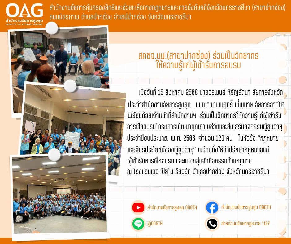 เมื่อวันที่ 15 สิงหาคม 2568 นายวรพนธ์ หิรัญรัตนา อัยการจังหวัดประจำสำนักงานอัยการสูงสุด , พ.ต.อ.เทพนฤทธิ์ พี่พิมาย อัยการอาวุโส พร้อมด้วยเจ้าหน้าที่สำนักงานฯ ร่วมเป็นวิทยากรให้ความรู้แก่ผู้เข้ารับการฝึกอบรมโครงการพัฒนาคุณภาพชีวิตและส่งเสริมกิจกรรมผู้สูงอายุประจำปีงบประมาณ พ.ศ. 2568 จำนวน 120 คน ในหัวข้อ “กฎหมายและสิทธิประโยชน์ของผู้สูงอายุ” พร้อมทั้งให้คำปรึกษากฎหมายแก่ผู้เข้ารับการฝึกอบรม และแบ่งกลุ่มจัดกิจกรรมด้านกฎมาย ณ โรงแรมเดอะเปียโน รีสอร์ท อำเภอปากช่อง จังหวัดนครราชสีมา
