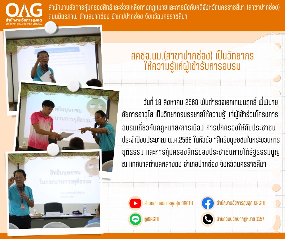 วันที่ 19 สิงหาคม 2568 พันตำรวจเอกเทพนฤทธิ์ พี่พิมาย อัยการอาวุโส เป็นวิทยากรบรรยายให้ความรู้ แก่ผู้เข้าร่วมโครงการอบรมเกี่ยวกับกฎหมาย/การเมือง การปกครองให้กับประชาชน ประจำปีงบประมาณ พ.ศ.2568 ในหัวข้อ “สิทธิมนุษยชนในกระบวนการยุติธรรม และการคุ้มครองสิทธิของประชาชนภายใต้รัฐธรรมนูญ ณ เเทศบาลตำบลกลางดง อำเภอปากช่อง จังหวัดนครราชสีมา