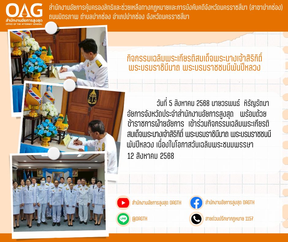 วันที่ 5 สิงหาคม 2568 นายวรพนธ์ หิรัญรัตนา อัยการจังหวัดประจำสำนักงานอัยการสูง ปฏิบัติราชการในหน้าที่ผู้กลั่นกรองงาน , พันตำนรวจเอกเทพนฤทธิ์ พี่พิมาย อัยการอาวุโส พร้อมด้วยข้าราชการธุรการ สำนักงานอัยการคุ้มครองสิทธิและช่วยเหลือทางกฎหมายและการบังคับดคีจังหวัดนครราชสีมา (สาขาปากช่อง) ร่วมกิจกรรมเฉลิมพระเกียรติสมเด็จพระนางเจ้าสิริกิติ์ พระบรมราชินีนาถ พระบรมราชชนนีพันปีหลวง เนื่องในโอกาสวันเฉลิมพระชนมพรรษา 12 สิงหาคม 2568