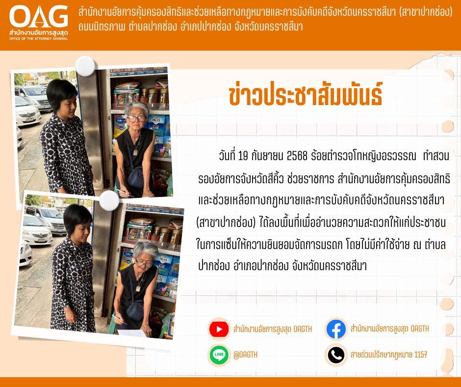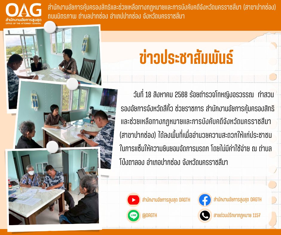 วันที่ 19 กันยายน 568 ร้อยตำรวจโทหญิงอรวรรณ ทำสวน รองอัยการจังหวัดสีคิ้ว ช่วยราชการ สำนักงานอัยการคุ้มครองสิทธิและช่วยเหลือทางกฎหมายและการบังคับคดีจังหวัดนครราชสีมา (สาขาปากช่อง) ได้ลงพื้นที่เพื่ออำนวยความสะดวกให้แก่ประชาชน ในการเเซ็นให้ความยินยอมจัดการมรดก โดยไม่มีค่าใช้จ่าย ณ ตำบลปากช่อง อำเภอปากช่อง จังหวัดนครราชสีมา