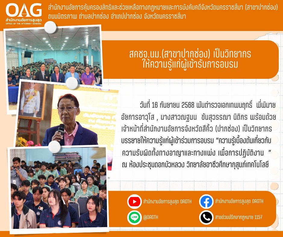 วันที่ 16 กันยายน 2568 พันตำรวจเอกเทพนฤทธิ์ พี่พิมาย อัยการอาวุโส , นางสาวณฐมน ขันสุวรรณา นิติกร พร้อมด้วยเจ้าหน้าที่สำนักงานอัยการจังหวัดสีคิ้ว (ปากช่อง) เป็นวิทยากรบรรยายให้ความรู้แก่ผู้เข้าร่วมการอบรม “ความรู้เบื้องต้นเกี่ยวกับความรับผิดทั้งทางอาญาและทางแพ่ง เพื่อการปฏิบัติงาน ” ณ ห้องประชุมดอกบัวหลวง วิทยาลัยอาชีวศึกษากุสุมภ์เทคโนโลยี