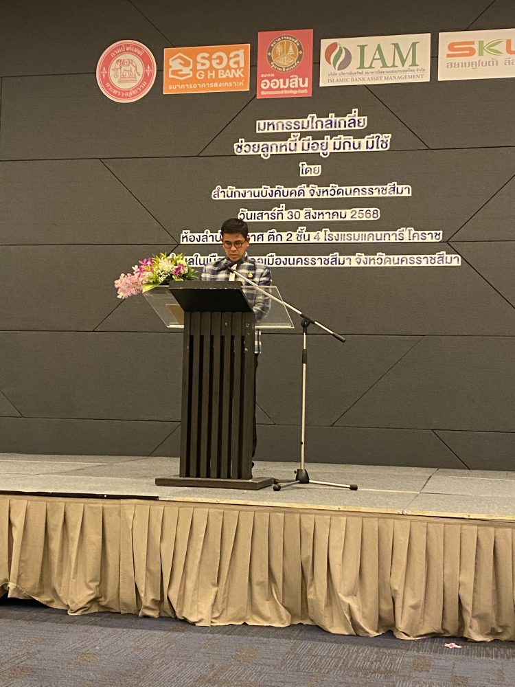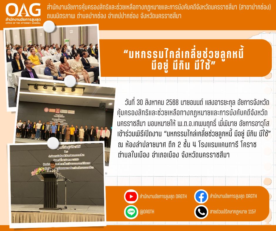 วันที่ 30 สิงหาคม 2568 นายอนนต์ แสงอารยะกุล อัยการจังหวัดคุ้มครองสิทธิและช่วยเหลือทางกฎหมายและการบังคับคดีจังหวัดนครราชสีมา มอบหมายให้ พ.ต.อ.เทพนฤทธิ์ พี่พิมาย อัยการอาวุโส เข้าร่วมพิธีเปิดงาน “มหกรรมไกล่เกลี่ยช่วยลูกหนี้ มีอยู่ มีกิน มีใช้” ณ ห้องลำปลายมาศ ตึก 2 ชั้น 4 โรงแรมแคนทารี โคราช ตำบลในเมือง อำเภอเมือง จังหวัดนครราชสีมา
