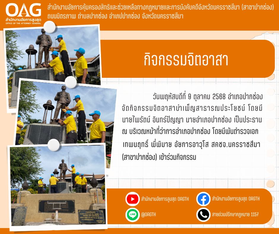 วันพฤหัสบดีที่ 9 ตุลาคม 2568 อำเภอปากช่องจัดกิจกรรมจิตอาสาบำเพ็ญสาธารณประโยชน์ โดยมีนายไพรัตน์ อินทร์ปัญญา นายอำเภอปากช่อง เป็นประธาน ณ บริเวณหน้าที่ว่าการอำเภอปากช่อง โดยมีพันตำรวจเอกเทพนฤทธิ์ พี่พิมาย อัยการอาวุโส สคชจ.นครราชสีมา (สาขาปากช่อง) เข้าร่วมกิจกรรม