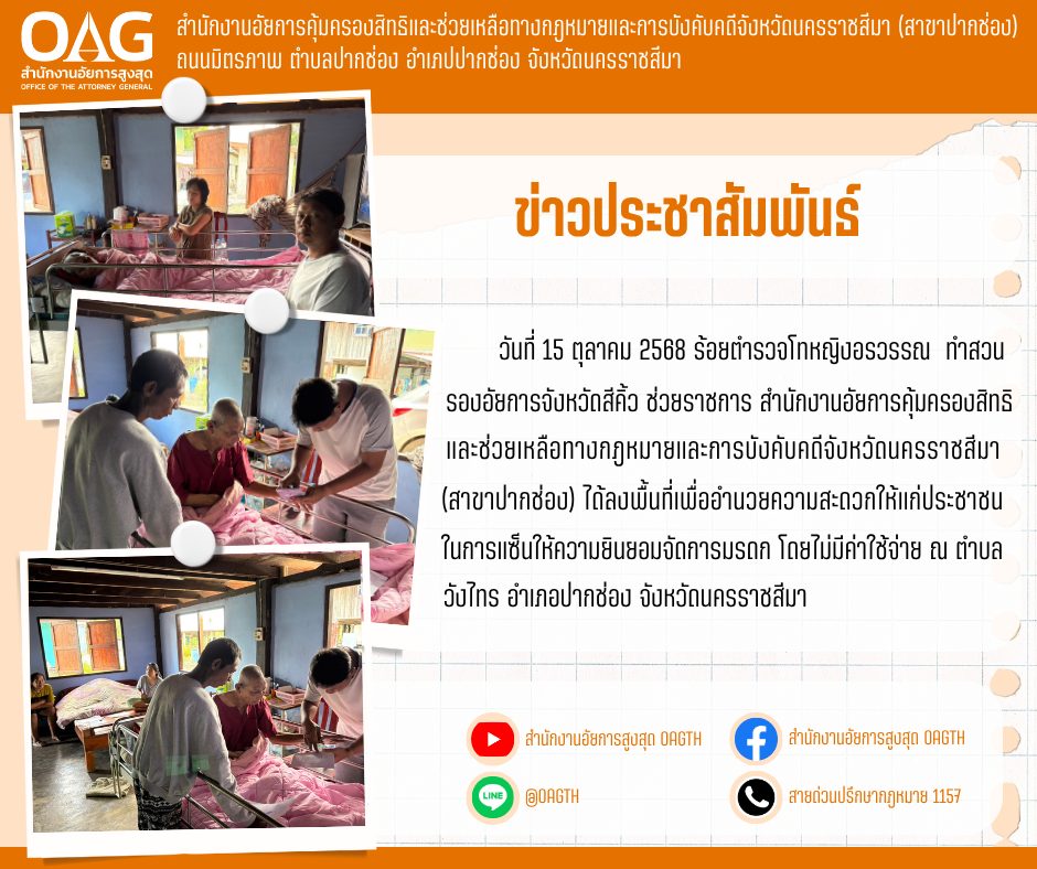 วันที่ 15 ตุลาคม 2568 ร้อยตำรวจโทหญิงอรวรรณ ทำสวน รองอัยการจังหวัดสีคิ้ว ช่วยราชการ สำนักงานอัยการคุ้มครองสิทธิและช่วยเหลือทางกฎหมายและการบังคับคดีจังหวัดนครราชสีมา (สาขาปากช่อง) ได้ลงพื้นที่เพื่ออำนวยความสะดวกให้แก่ประชาชน ในการเเซ็นให้ความยินยอมจัดการมรดก โดยไม่มีค่าใช้จ่าย ณ ตำบลวังไทร อำเภอปากช่อง จังหวัดนครราชสีมา