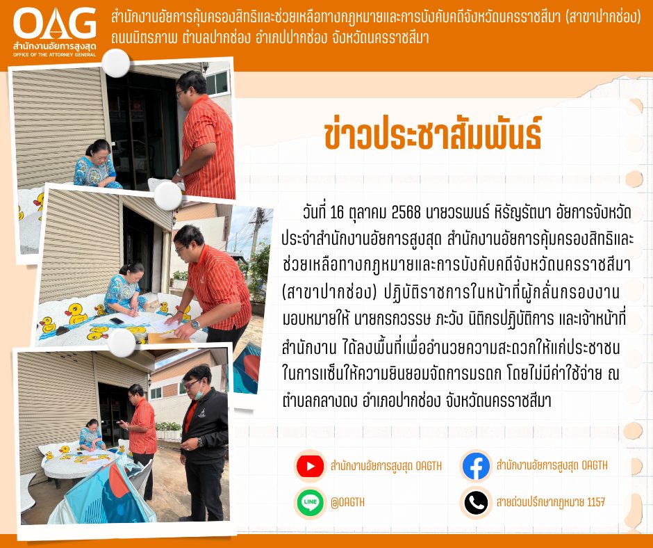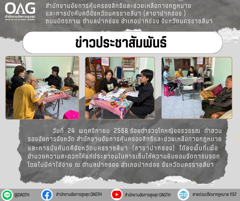 เมื่อวันที่ 24 พฤศจิกายน 2568 ร้อยตำรวจโทหญิงอรวรรณ ทำสวน รองอัยการจังหวัด สำนักงานอัยการคุ้มครองสิทธิและช่วยเหลือทางกฎหมายและการบังคับดคีจังหวัดนครราชสีมา (สาขาปากช่อง) ได้ลงพื้นที่เพื่ออำนวยความสะดวกให้แก่ประชาชนในการเซ็นให้ความยินยอมจัดการมรดกโดยไม่มีค่าใช้จ่าย ณ ตำบลปากช่อง อำเภอปากช่อง จังหวัดนครราชสีมา