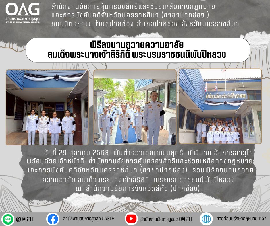 วันที่ 29 ตุลาคม 2568 พันตำรวจเอกเทพนฤทธิ์ พี่พิมาย อัยการอาวุโส พร้อมด้วยเจ้าหน้าที่ สำนักงานอัยการคุ้มครองสิทธิและช่วยเหลือทางกฎหมายและการบังคับคดีจังหวัดนครราชสีมา (สาขาปากช่อง) ร่วมพิธีลงนามถวายความอาลัย สมเด็จพระนางเจ้าสิริกิติ์ พระบรมราชชนนีพันปีหลวง ณ สำนักงานอัยการจังหวัดสีคิ้ว (ปากช่อง)