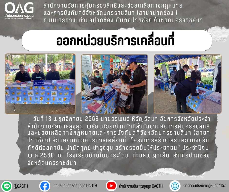 วันที่ 13 พฤศจิกายน 2568 นายวรพนธ์ หิรัญรัตนา อัยการจังหวัดประจำสำนักงานอัยการสูงสุด , นายศุภโชติ บัวสระแก้ว นิติกรปฏิบัติการ , นายกรกวรรษ ภะวัง นิติกรปฏิบัติการ และเจ้าหน้าที่สำนักงานอัยการคุ้มครองสิทธิและช่วยเหลือทางกฎหมายและการบังคับดคีจังหวัดนครราชสีมา (สาขาปากช่อง) ร่วมออกหน่วยบริการเคลื่อนที่ “โครงการสร้างเสริมความจงรักภักดีต่อสถาบัน บำบัดทุกข์ บำรุงสุข สร้างรอยยิ้มให้ประชาชน” ประจำปีงบพ.ศ.2568 ณ โรงเรียนบ้านโนนกระโดน ตำบลพญาเย็น อำเภอปากช่อง จังหวัดนครราชสีมา