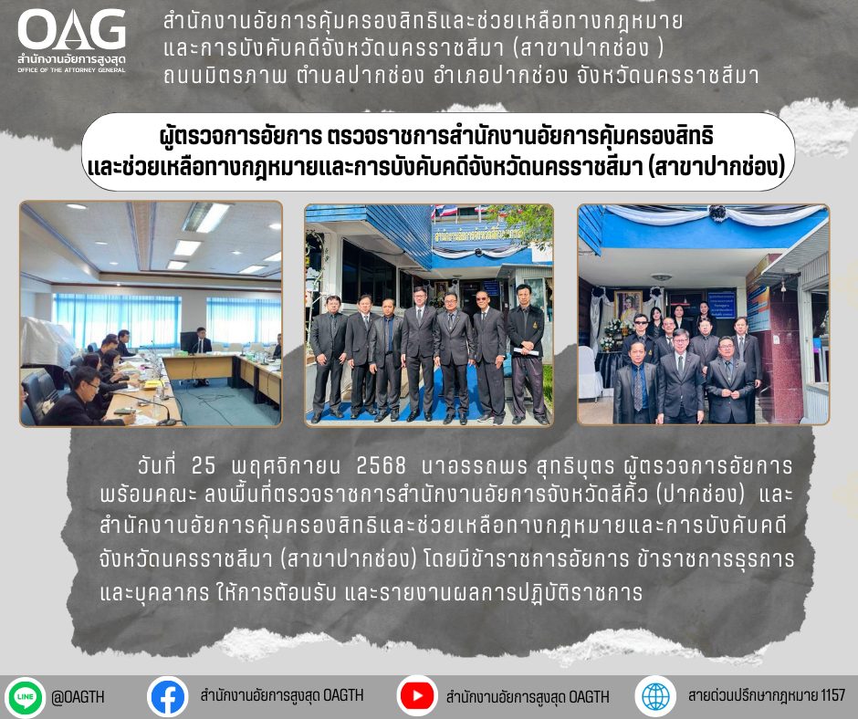 วันที่ 25 พฤศจิกายน 2568 นาอรรถพร สุทธิบุตร ผู้ตรวจการอัยการ พร้อมคณะ ลงพื้นที่ตรวจราชการสำนักงานอัยการจังหวัดสีคิ้ว (ปากช่อง) และสำนักงานอัยการคุ้มครองสิทธิและช่วยเหลือทางกฎหมายและการบังคับคดีจังหวัดนครราชสีมา (สาขาปากช่อง) โดยมีข้าราชการอัยการ ข้าราชการธุรการและบุคลากร ให้การต้อนรับ และรายงานผลการปฏิบัติราชการ