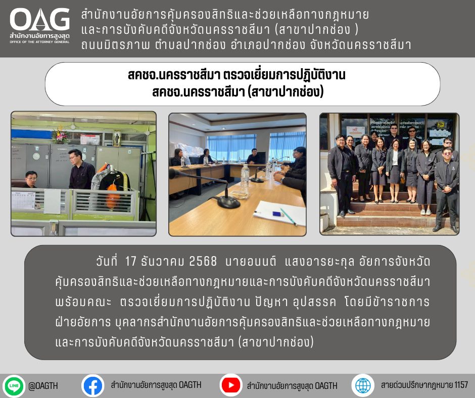 วันที่ 17 ธันวาคม 2568 นายอนนต์ แสงอารยะกุล อัยการจังหวัด คุ้มครองสิทธิและช่วยเหลือทางกฎหมายและการบังคับคดีจังหวัดนครราชสีมาพร้อมคณะ ตรวจเยี่ยมการปฏิบัติงาน ปัญหา อุปสรรค โดยมีข้าราชการฝ่ายอัยการ บุคลากรสำนักงานอัยการคุ้มครองสิทธิและช่วยเหลือทางกฎหมายและการบังคับคดีจังหวัดนครราชสีมา (สาขาปากช่อง)