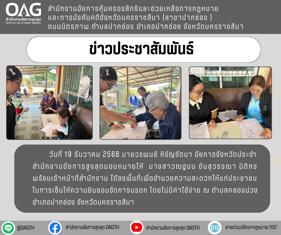 วันที่ 19 ธันวาคม 2568 นายวรพนธ์ หิรัญรัตนา อัยการจังหวัดประจำสำนักงานอัยการสูงสุดมอบหมายให้ นางสาววันทนีย์ นวลแก้ว นักจัดการงานทั่วไปปฏิบัติการ นางสาวณฐมน ขันสุวรรณา นิติกร พร้อมเจ้าหน้าที่สำนักงาน ได้ลงพื้นที่เพื่ออำนวยความสะดวกให้แก่ประชาชนในการเซ็นให้ความยินยอมจัดการมรดก โดยไม่มีค่าใช้จ่าย ณ ตำบลคลองม่วง อำเภอปากช่อง จังหวัดนครราชสีมา